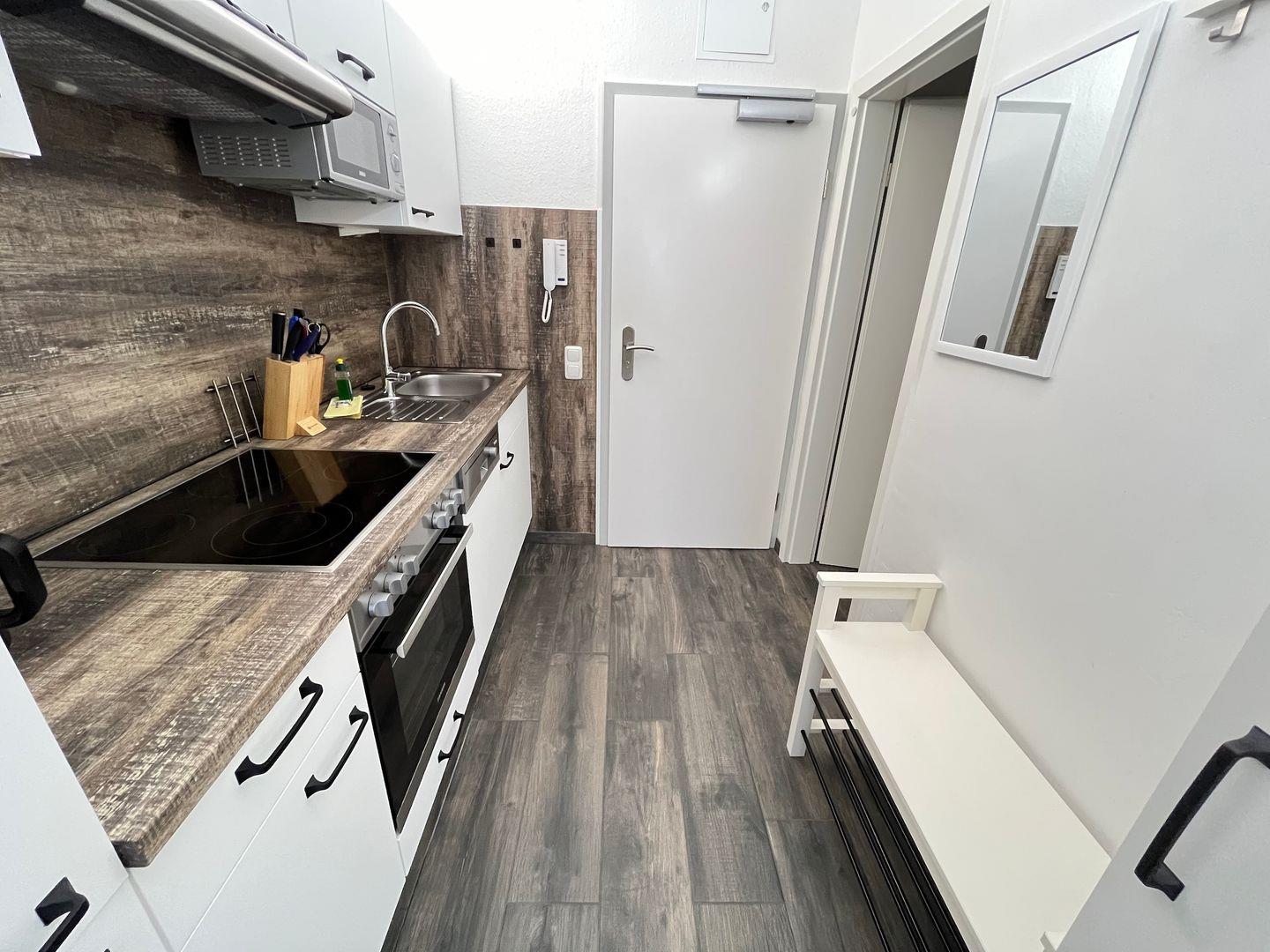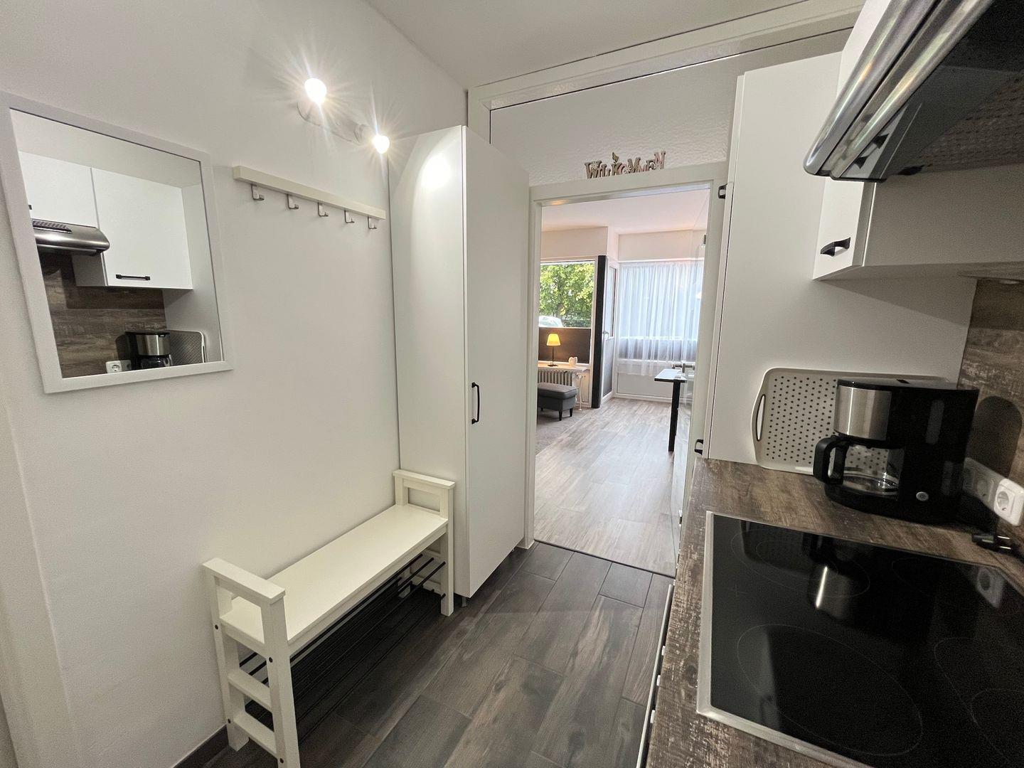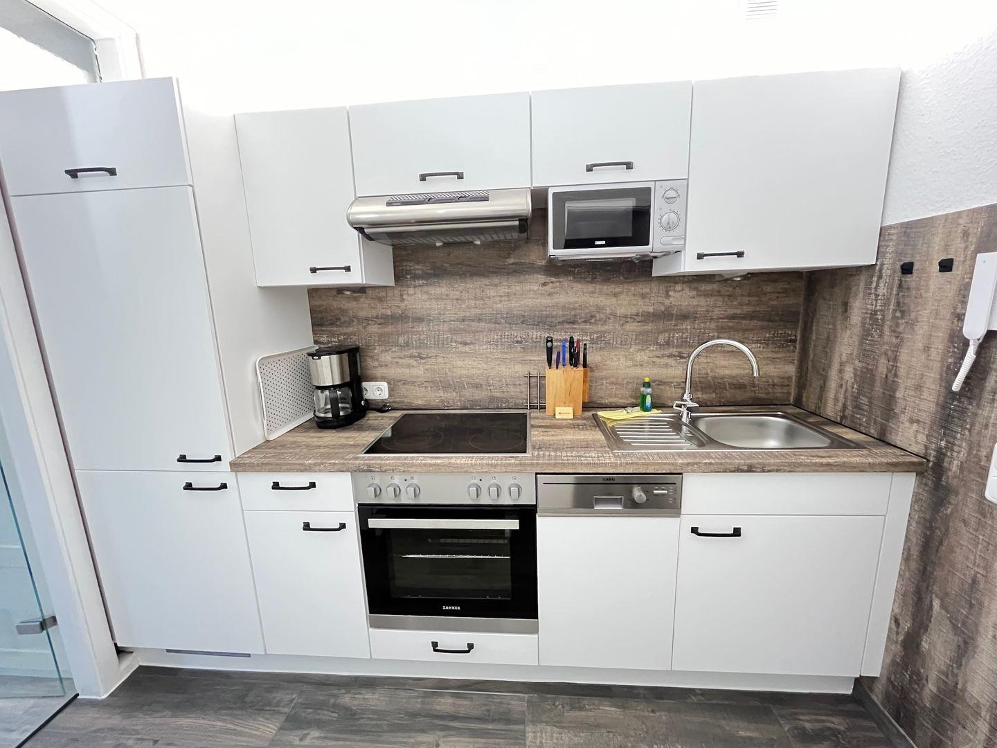 Für Selbstverpfleger bietet diese Wohnung in der separaten, ebenfalls renovierten Küche einen Herd mit 4 Kochfeldern und Backofen, Mikrowelle, Kühlschrank mit Gefrierfach, Spülmaschine, Kaffeemaschine, Toaster, Eierkocher, Mixer, digitale Küchenwaage und Wasserkocher.