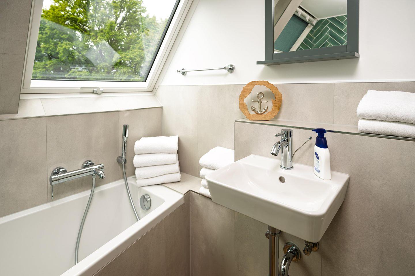 2025 fertiggestellte FeWo in Strandnähe (mit Ostseeblick) in Grömitz. Die Wohnung erstreckt sich über zwei Etagen und bietet mit drei Schlafzimmern und zwei Bädern Platz für bis zu 6 Personen. Im Dachgeschoss befindet sich ein großzügiger Wohnbereich mit Anschluss an einen 12,5 m^2 Balkon. Die Küche ist voll ausgestattet, in jedem Schlafzimmer befindet sich ein TV, an heißen Tagen sorgt die Klimaanlage für Abkühlung und die Sauna und Whirlwanne sorgen für ein schönes Extra an Luxus.