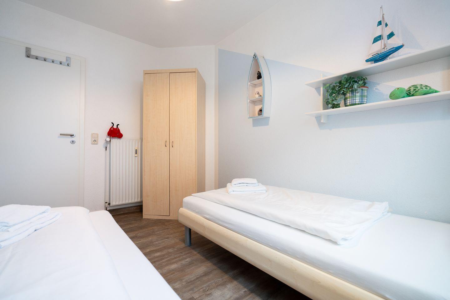 Im Obergeschoss des Ferienapartments erwartet Sie ein Wohnbereich mit einer gemütlichen Sofaecke und einem Essplatz. Das Sofa bietet eine komfortable Schlafmöglichkeit für eine Person. Zusätzlich finden Sie hier die gut ausgestattete Einbauküche, eines der beiden Schlafzimmer mit zwei Einzelbetten und das "Mini-Duschbad".