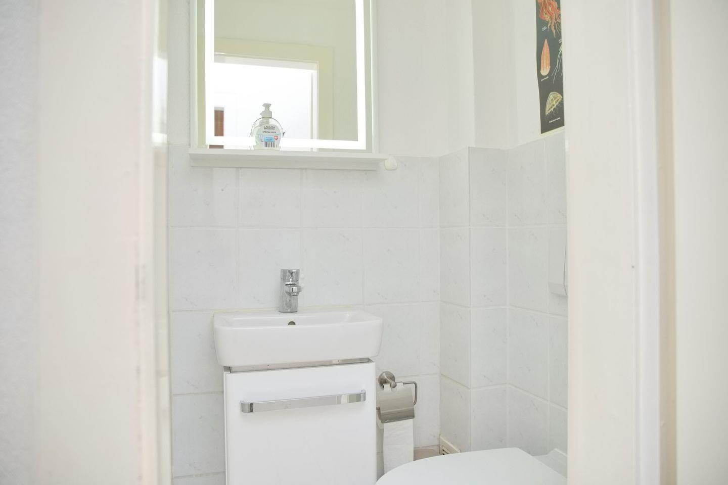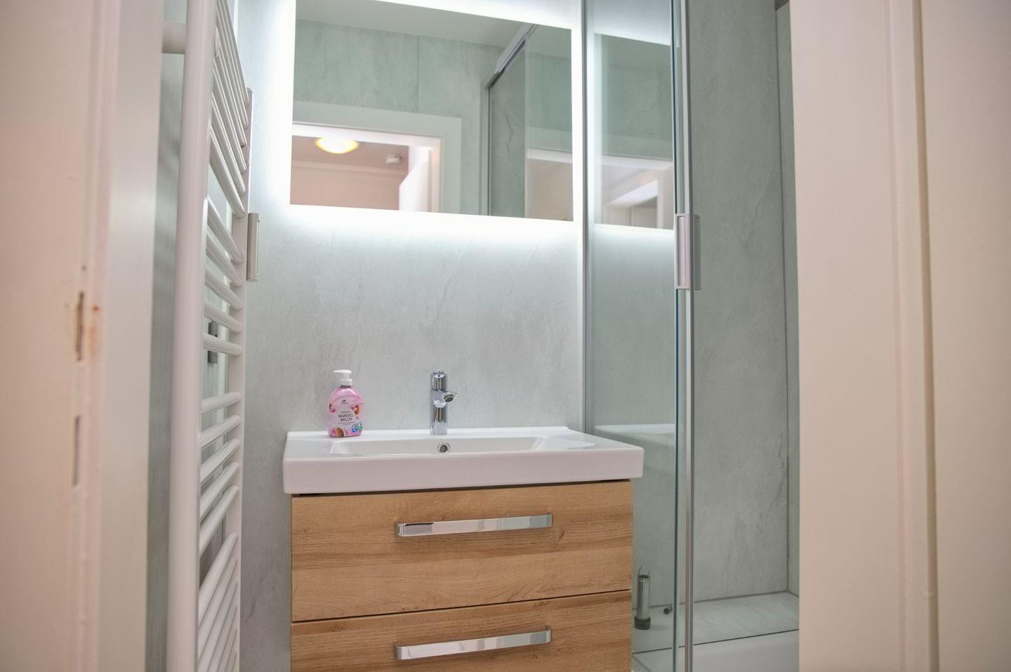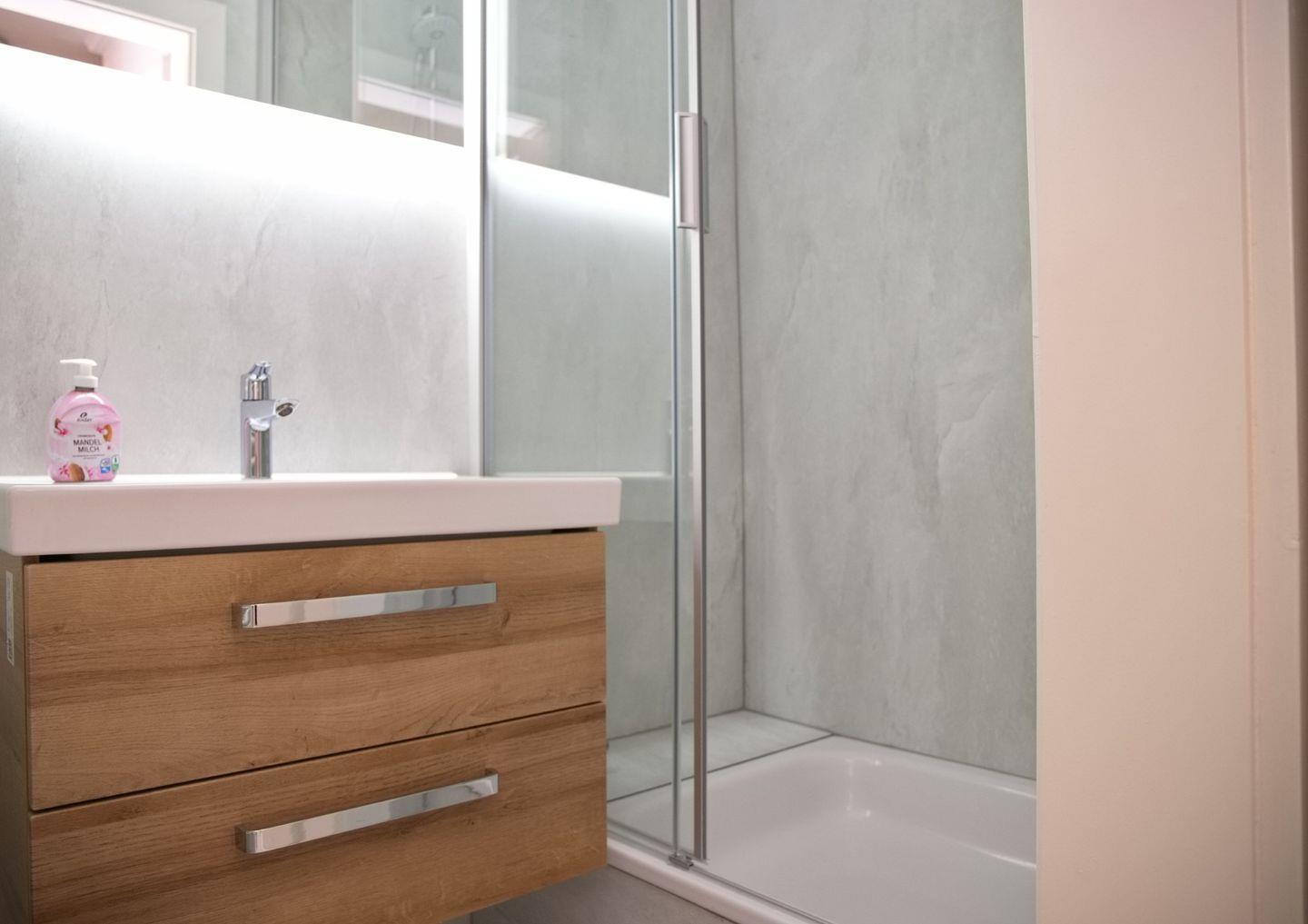 Das moderne Badezimmer der Ferienwohnung verfügt über eine Dusche, ein Waschbecken, einen Spiegelschrank mit Beleuchtung und einen Handtuchheizkörper. Zusätzlich gibt es ein separates WC mit Waschtisch und Spiegel – für noch mehr Komfort während eures Urlaubs an der Ostsee.