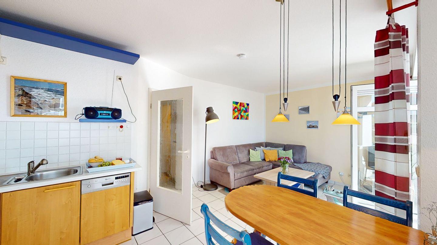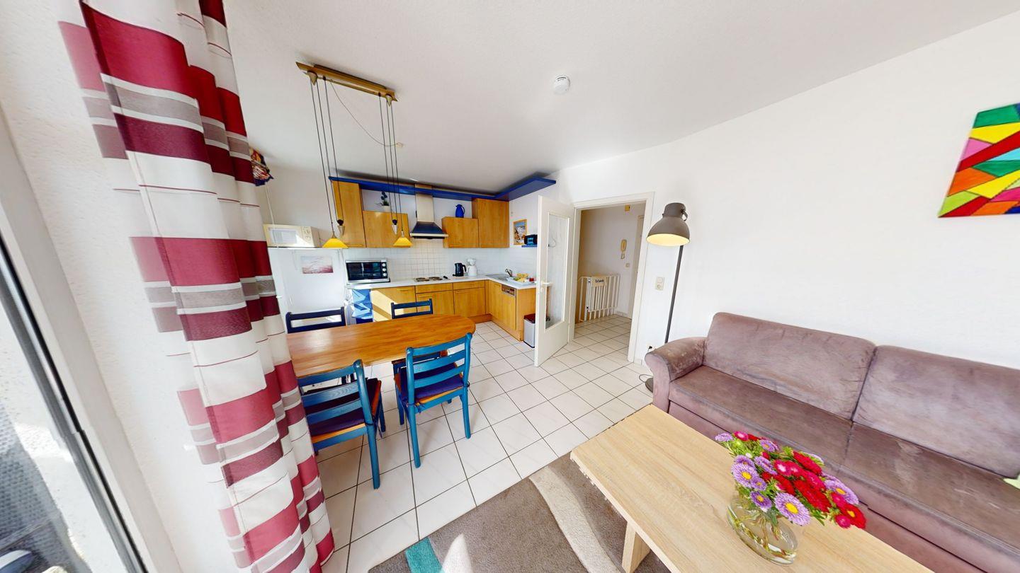 Die helle Wohnung bietet einen Wohn- /Essbereich mit offener Küchenzeile, einen möblierten Balkon, ein Gäste- WC und ein modernes Badezimmer mit Dusche. Eins der Schlafzimmer verfügt über ein Doppelbett, das andere über zwei Einzelbetten - in beiden Schlafzimmern wurde ein neuer Design-Plankenboden verlegt, der für ein modernes, gesundes Raumklima sorgt.