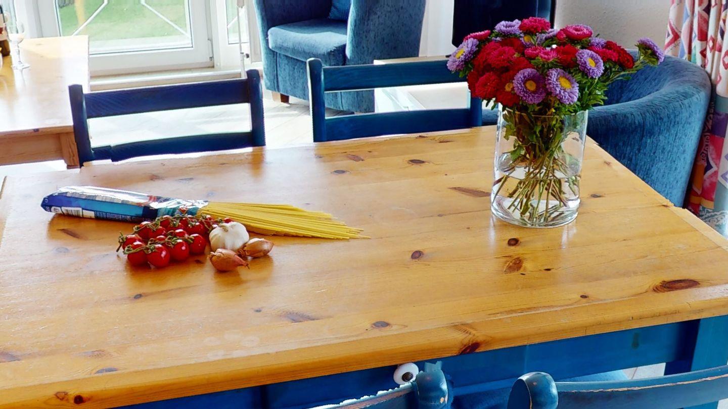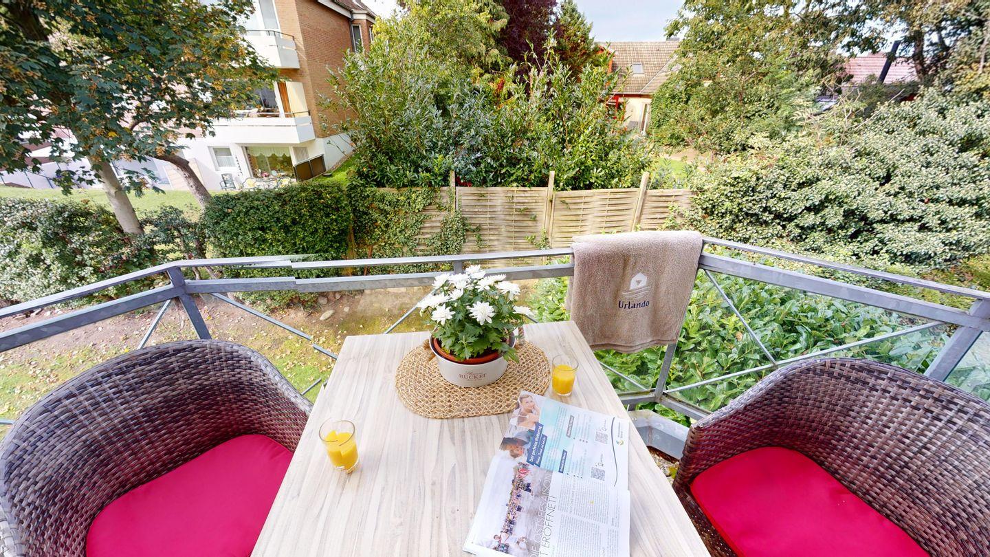 Der einladende Wohn-/Essbereich wird ergänzt durch die offene Küchenzeile mit einem farbenfrohen Essbereich. Von hier aus gelangen Sie zum möblierten Balkon, der Sie zu Schönen Stunden an der frischen Luft einlädt.