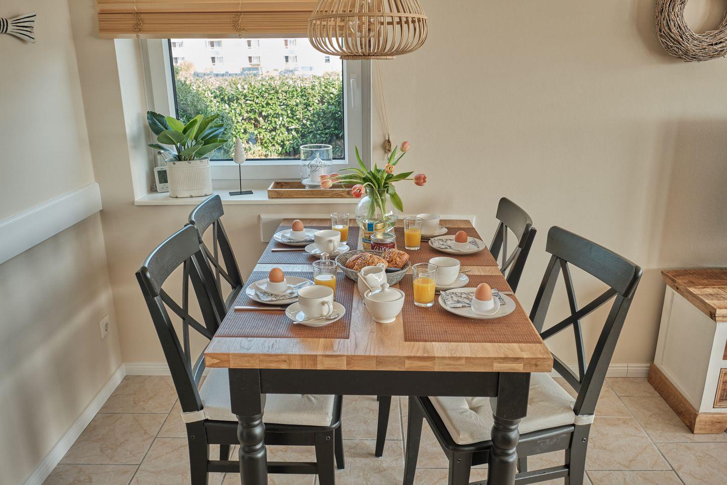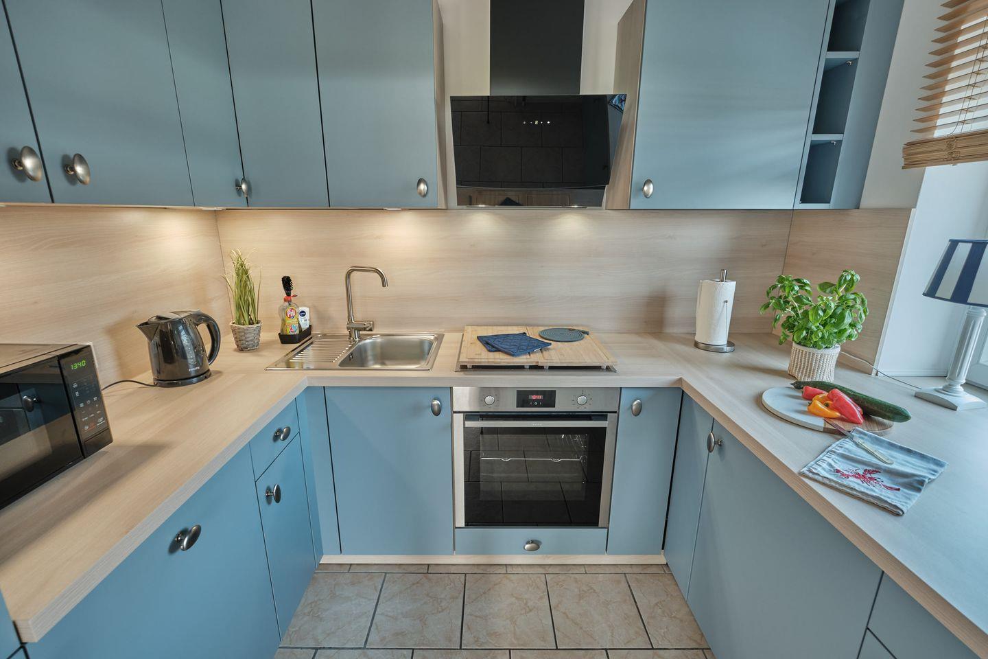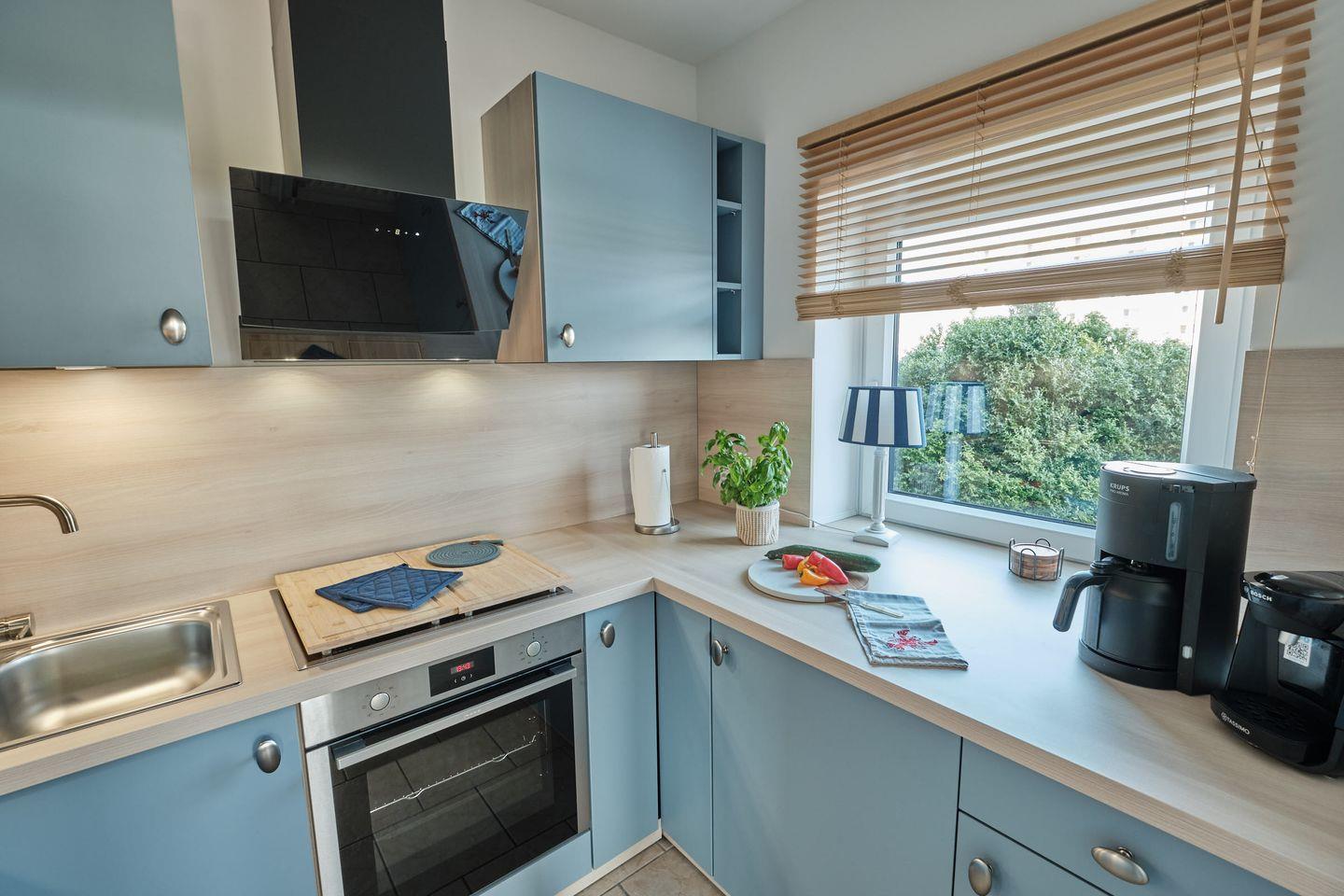 Die geräumige Küche verfügt über alles notwendige für Ihren Aufenthalt. Neben einer Spülmaschine und einem Backofen befindet sich auch eine Mikrowelle, sowie zusätzlich zur herkömmlichen Kaffeemaschine noch eine Tassimo Maschine in der Küche.
