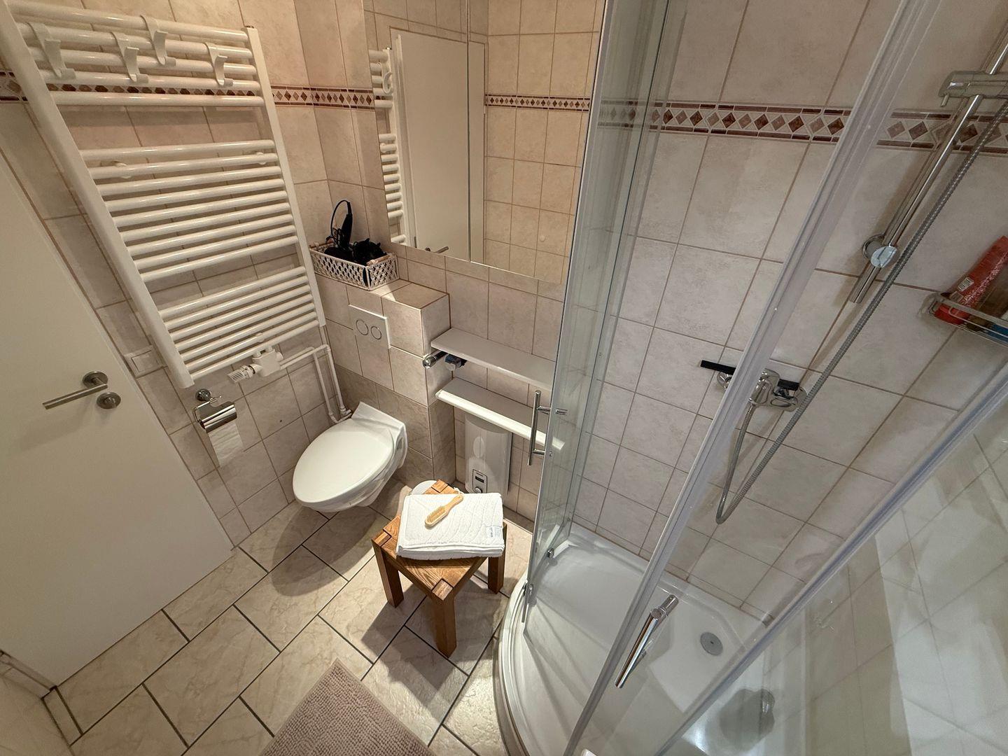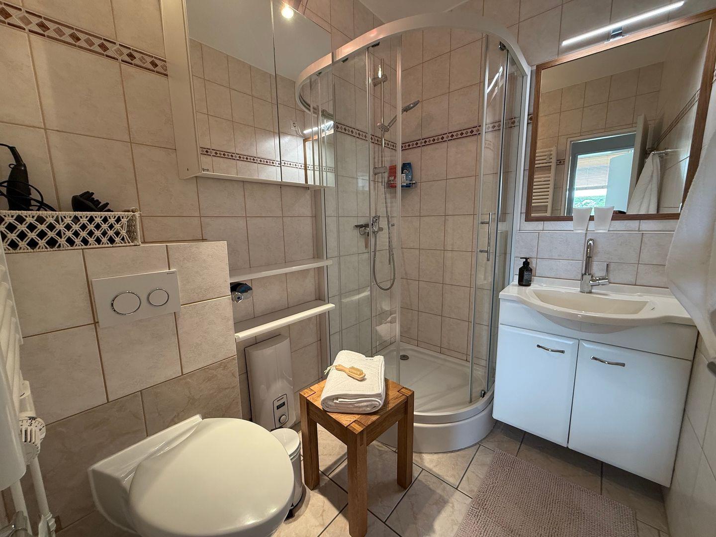 Das Badezimmer verfügt über eine Dusche, WC, Waschtisch und Föhn.