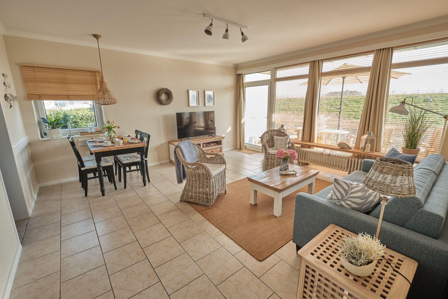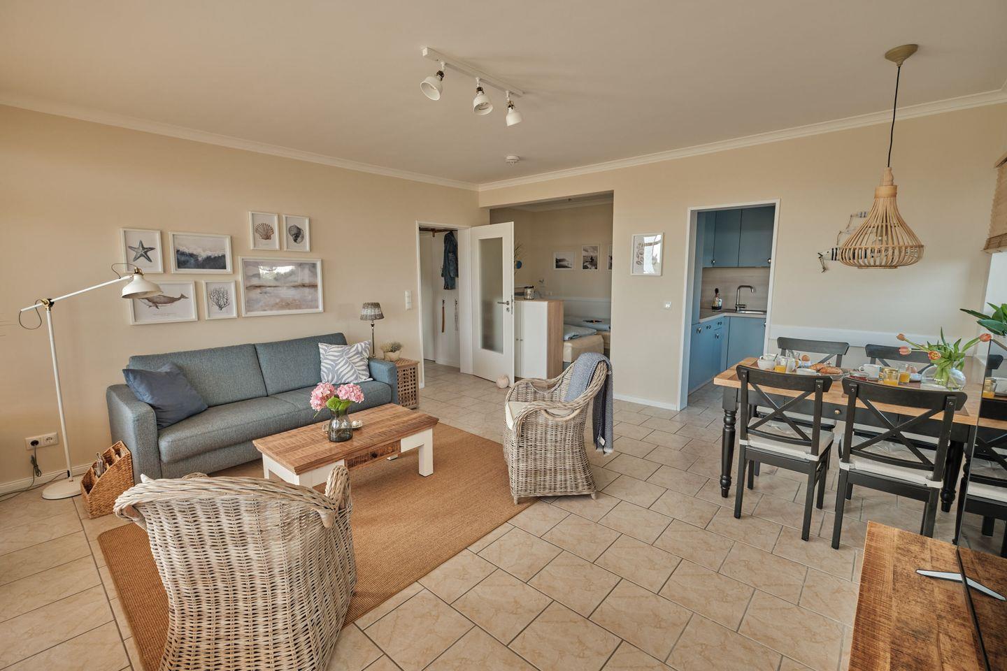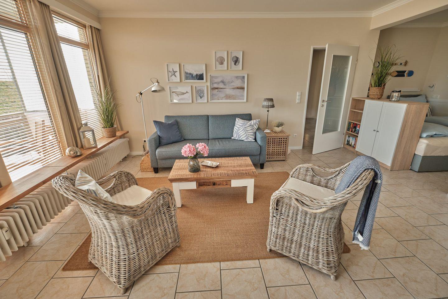 Das helle und gemütliche Wohnzimmer bietet Ihnen einen Smart-TV, kostenlosen WLAN-Zugang, einen Essbereich und den halb abgeteilten weiteren Schlafbereich mit zwei einzelnen Boxspringbetten, welche sich auch problemlos zusammen schieben lassen (jeweils 80cm x 200cm).