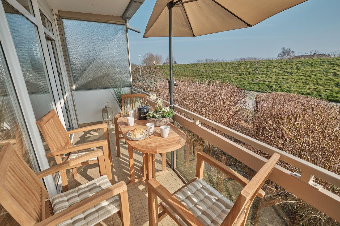 Ein direkter Zugang führt vom Wohnzimmer auf den möblierten Balkon. Genießen Sie zahlreiche Sonnenstunden und die frische Meeresbrise, lassen Sie hier entspannt Ihre Urlaubstage ausklingen.
