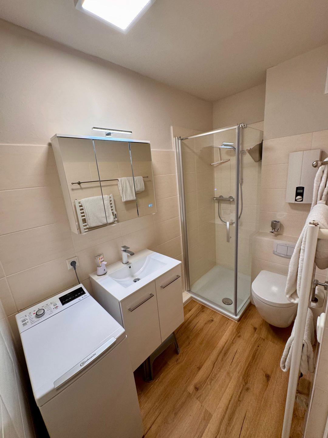 Das Badezimmer der Ferienwohnung ist mit einer modernen Dusche ausgestattet, sodass Sie nach einem langen Tag am Strand erfrischend duschen können.