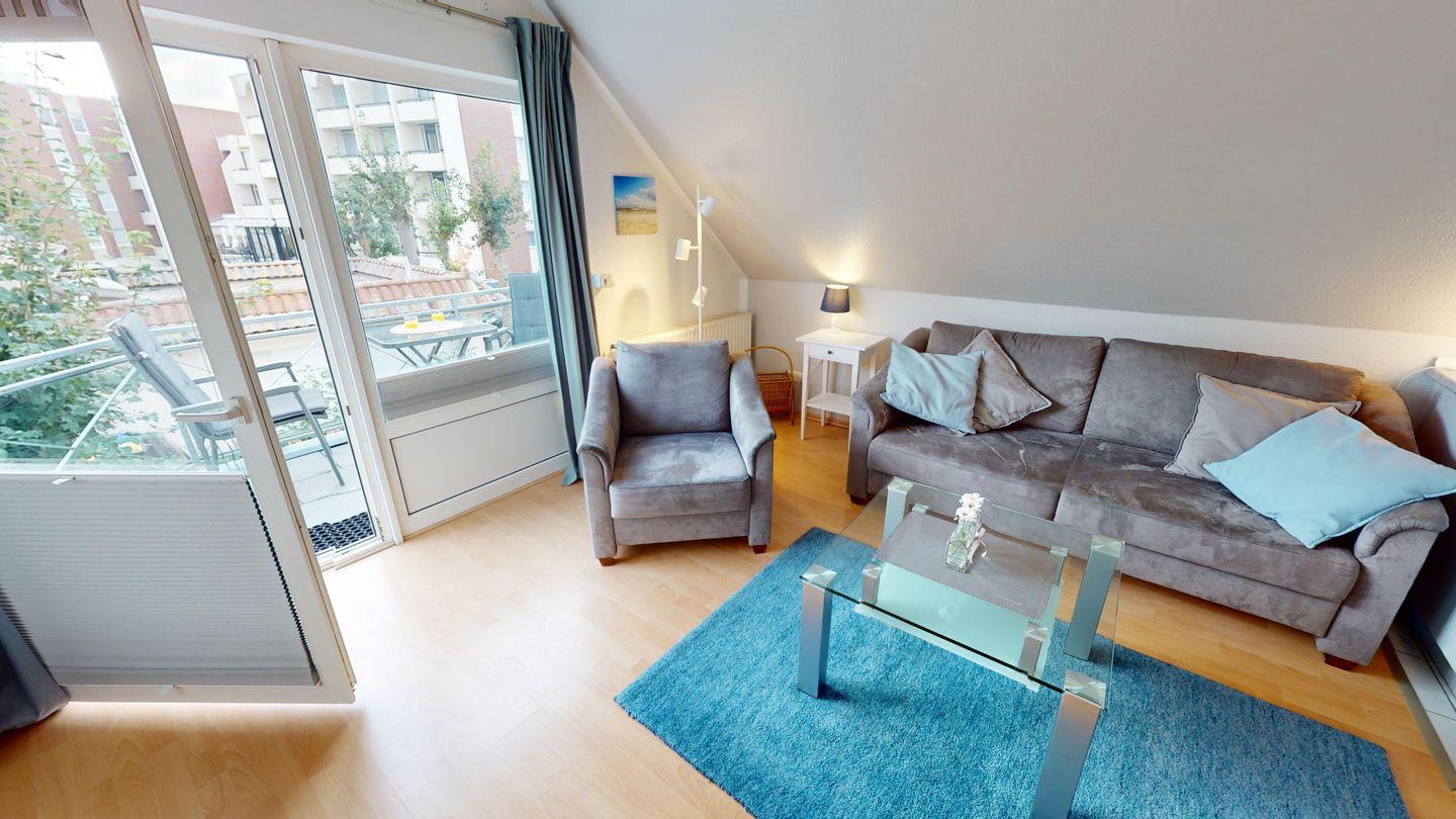 Über den Wohnbereich gelangen Sie auf den möblierten Süd-Ost-Balkon – genießen Sie Ihr Frühstück oder die Abendstunden an der frischen Ostseeluft!