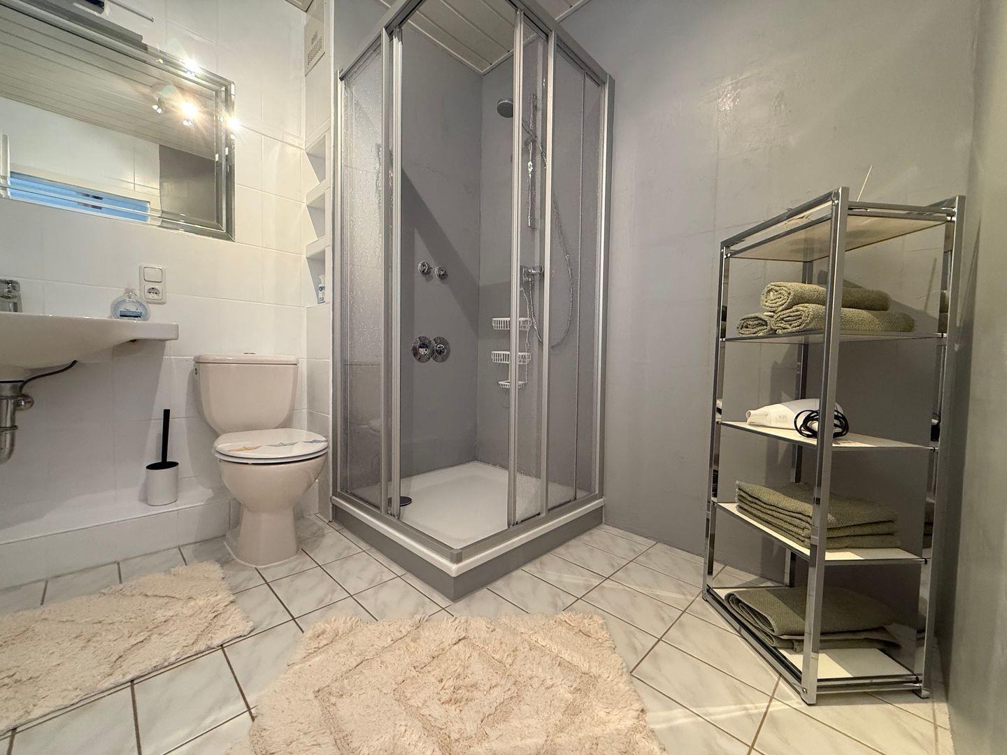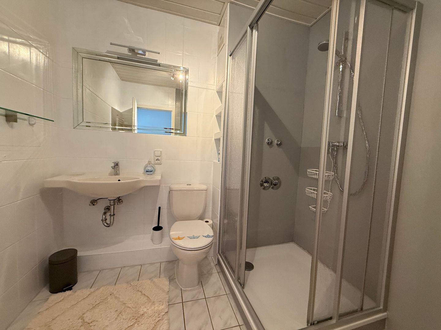 Das Badezimmer verfügt über eine Dusche, WC, Waschtisch und Föhn.