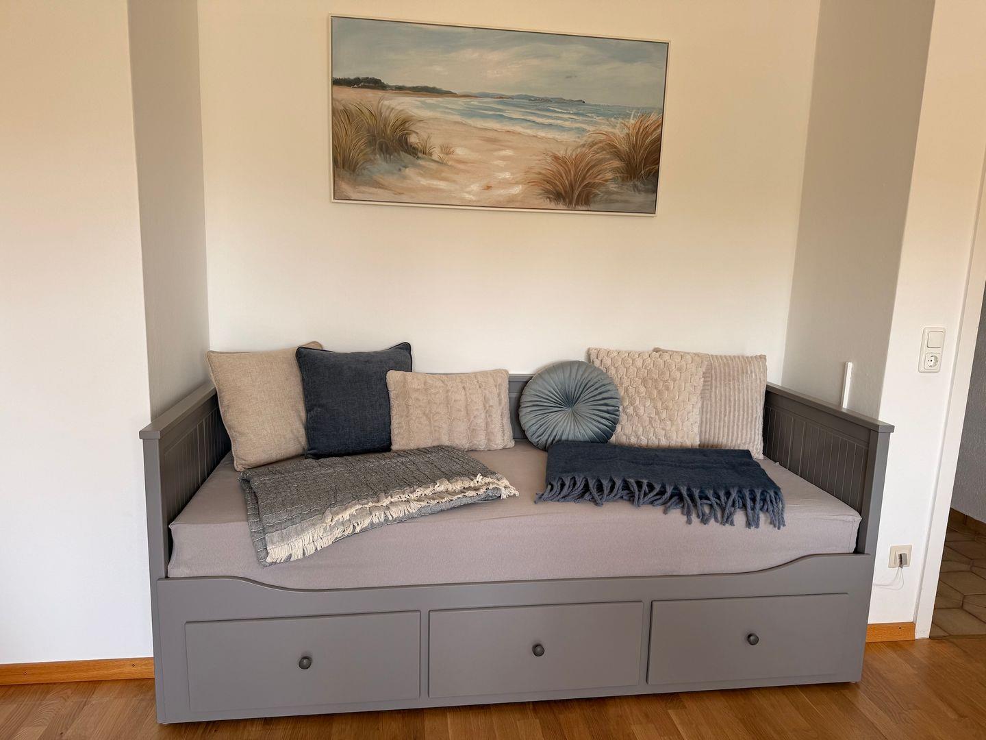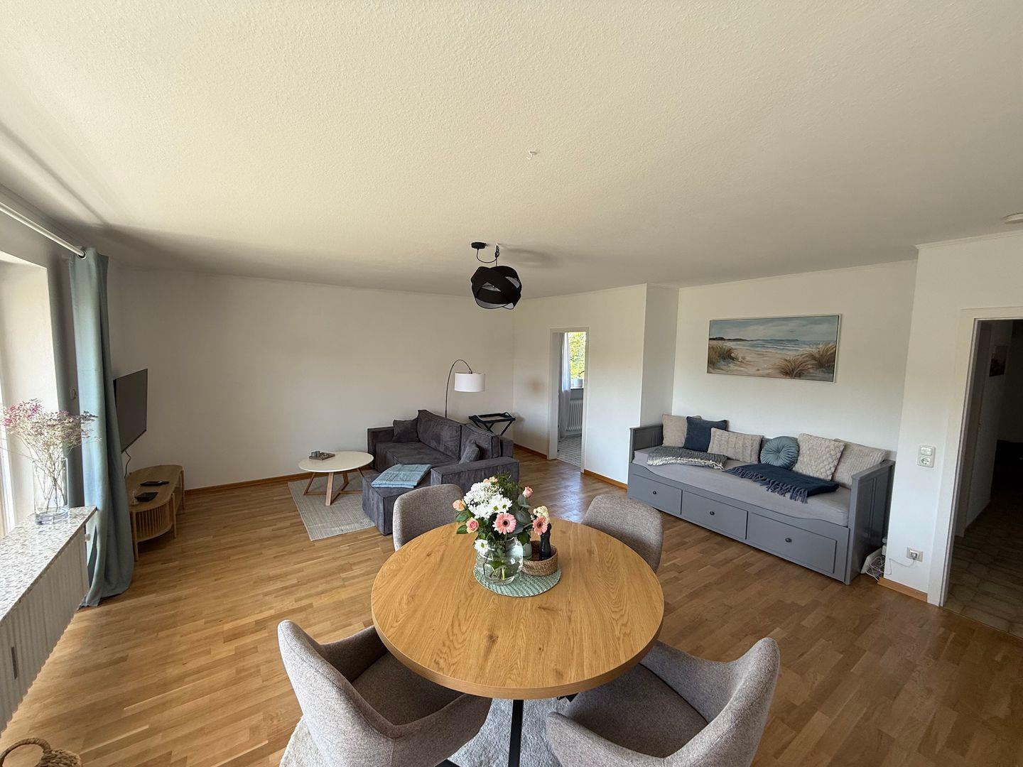 Das helle und gemütliche Wohnzimmer bietet Ihnen eine Sofaecke (Schlafsofa 140cm Breite) mit Smart-TV, kostenlosen WLAN-Zugang, einen Essbereich und ein zusätzliches Bett, welches sich im Handumdrehen in ein komfortables Doppelbett verwandeln lässt (2x80cm Matratzen).