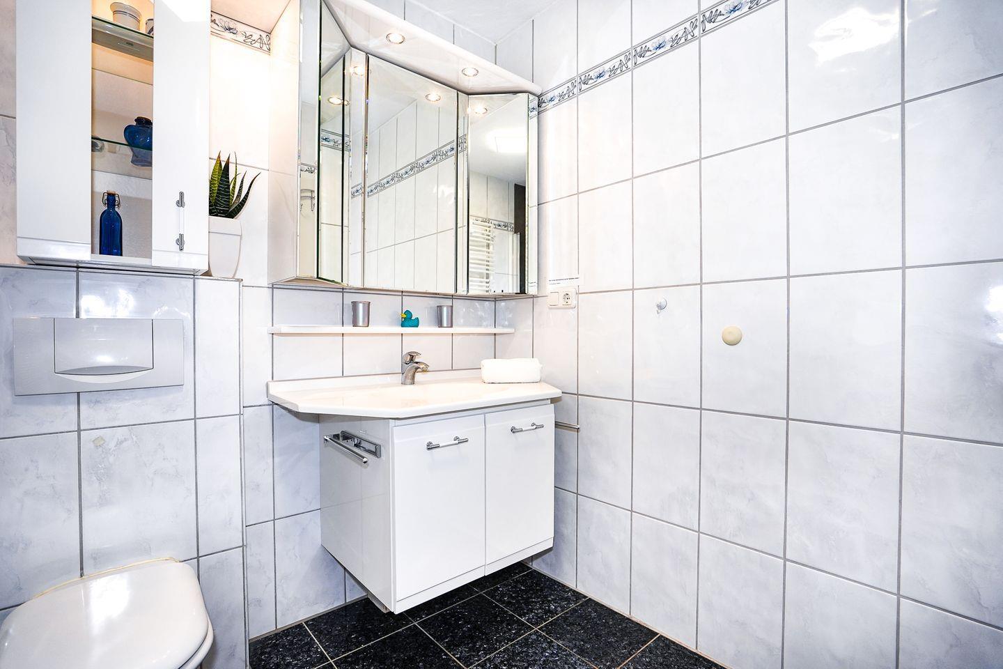 Das Badezimmer ist mit einer Dusche, Waschbecken, WC, Spiegel und warmem Wasser ausgestattet. Ein Ganzkörperspiegel, Wäscheständer, Staubsauger und weitere nützliche Utensilien stehen bereit.