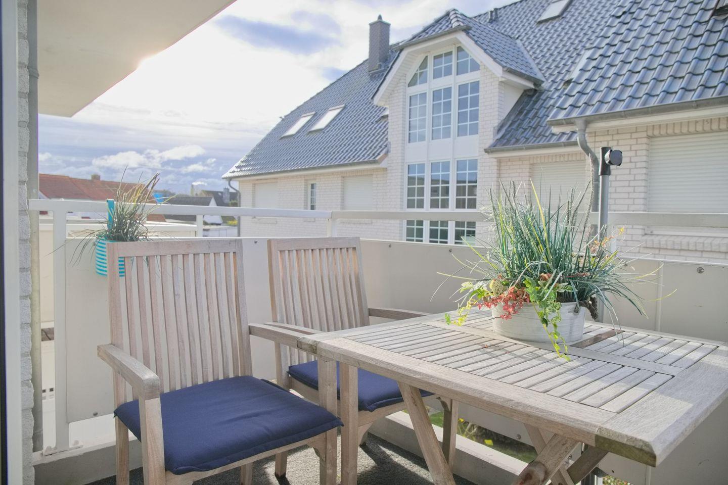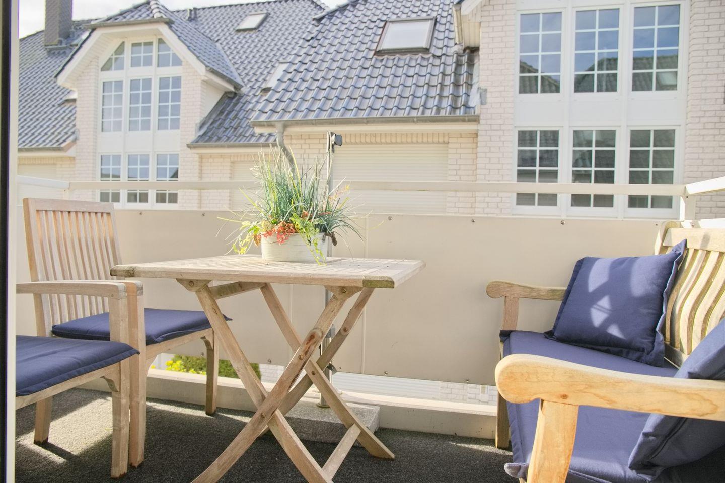 Ein besonderes Highlight ist der eigene Balkon, der mit Gartenmöbeln und Sonnenschirm ausgestattet ist – der ideale Platz zum Entspannen, Lesen oder um den Tag an der frischen Luft ausklingen zu lassen.