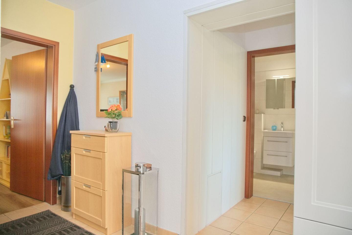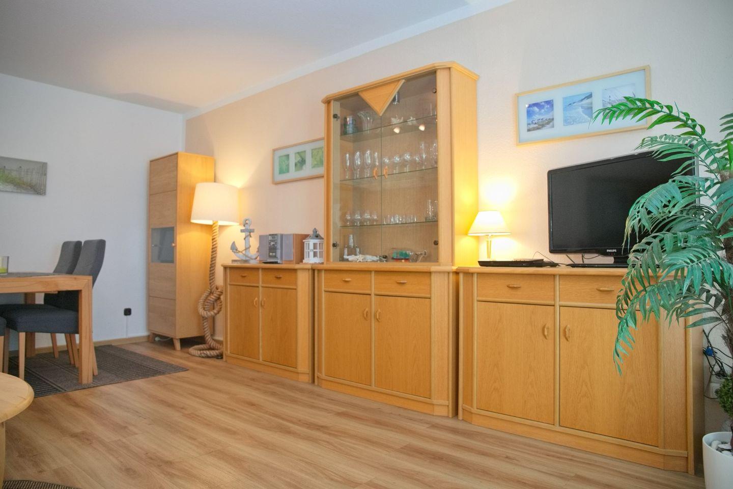 Das wohnliche Ambiente wird durch moderne und komfortable Ausstattungselemente ergänzt. Im Wohnbereich sorgt ein TV mit DVD- und Blu-ray-Player, CD-Spieler sowie Radio für abwechslungsreiche Unterhaltung, während Gesellschaftsspiele gesellige Abende versprechen. Ein Ganzkörperspiegel, ein Wäscheständer, ein Schuhschrank und eine praktische Garderobe erleichtern den Alltag. Für Stauraum stehen eine Kommode und weitere Möbel zur Verfügung.