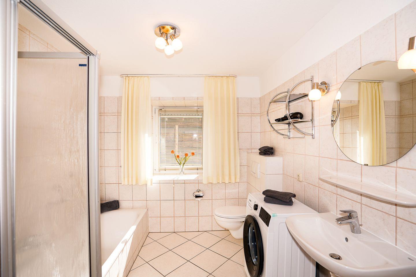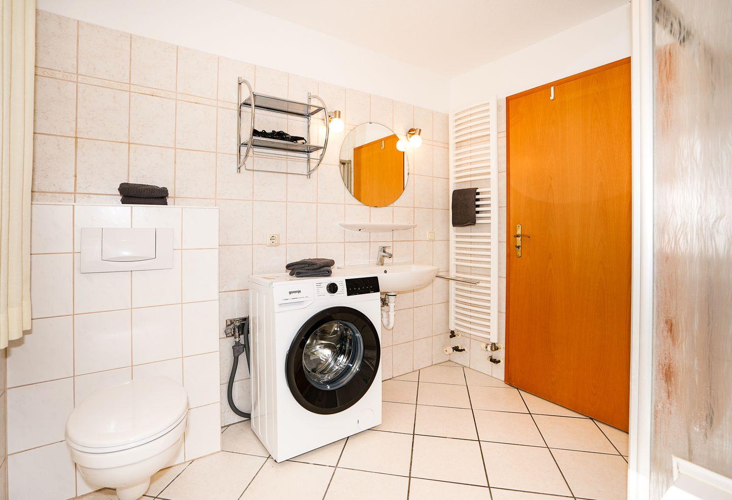 Das Badezimmer bietet sowohl Dusche (1) als auch Badewanne, außerdem WC, Waschbecken, Spiegel, Fenster und warmes Wasser; ein Haartrockner ist vorhanden. Für längere Aufenthalte ist die Waschmaschine zur Eigennutzung ein zusätzlicher Komfort, ebenso Wäscheständer und Abfalleimer.