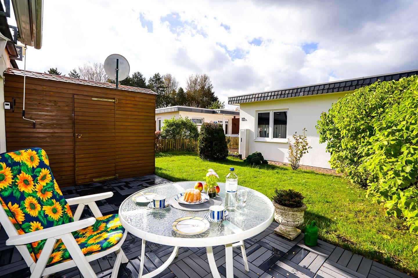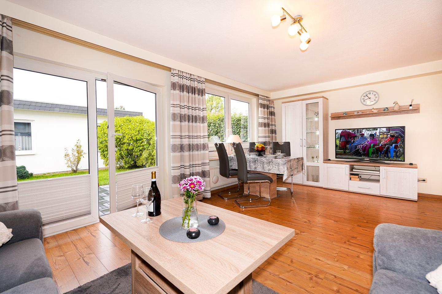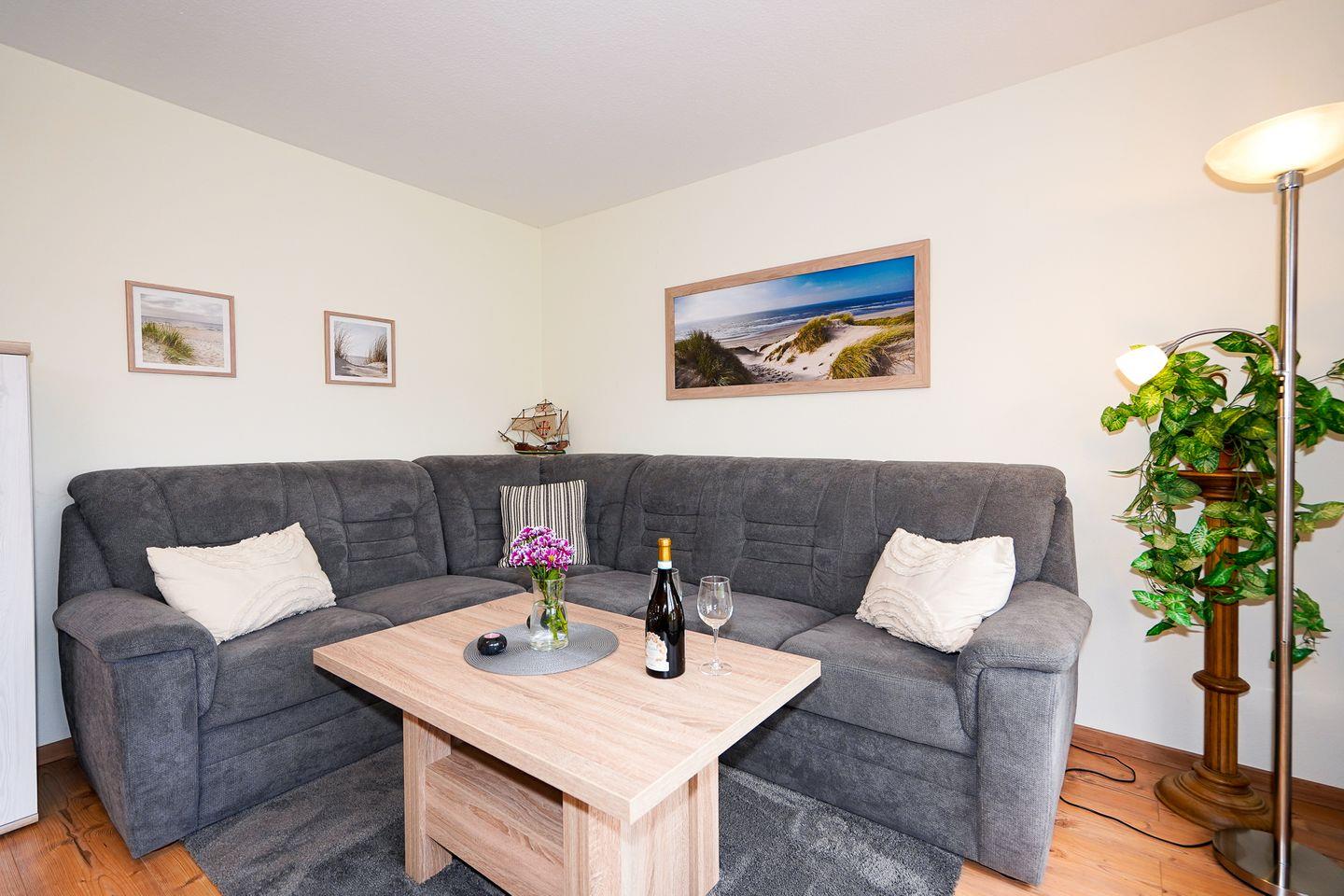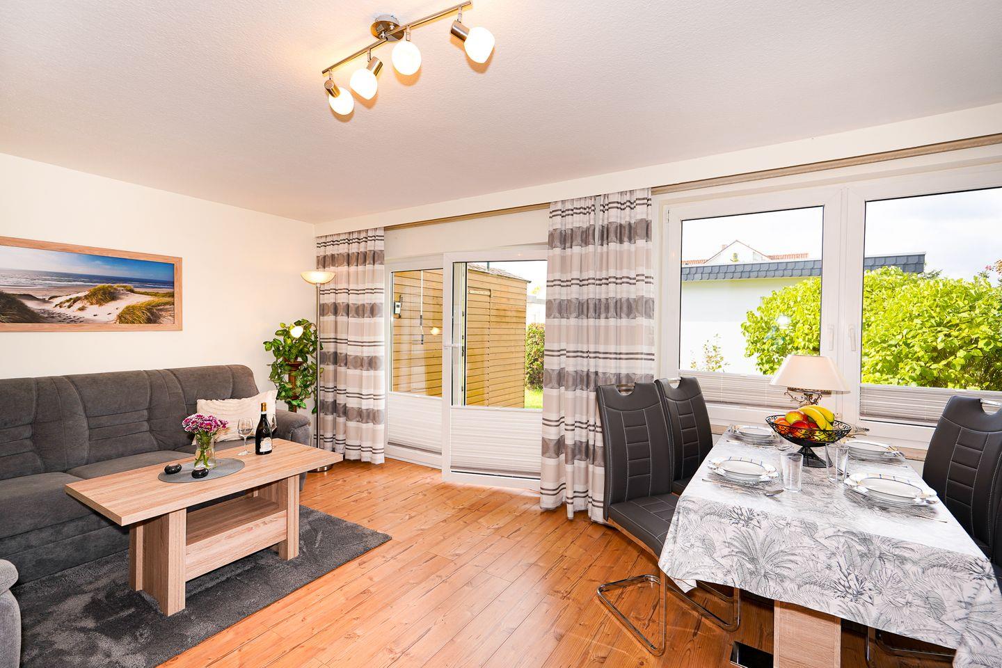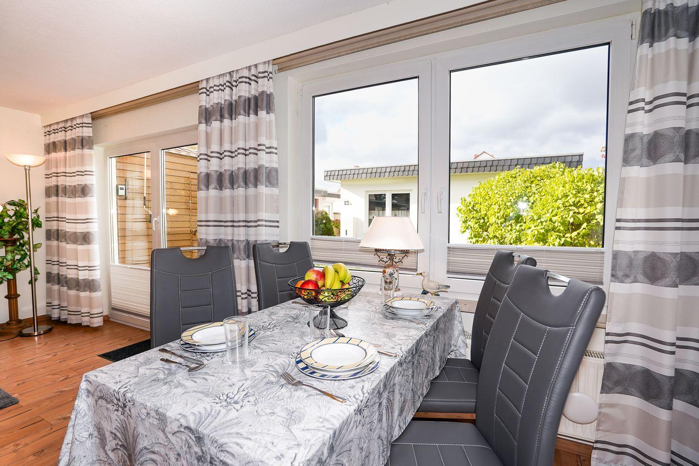 Im Wohnbereich erwartet Sie eine Sofaecke mit Sofa und TV (1 Gerät) sowie Radio; der Boden ist mit Laminat ausgestattet. Dank Sichtschutz an allen Fenstern genießen Sie Privatsphäre, und Internet/WLAN ist vorhanden. Die Unterkunft verfügt über einen Essbereich mit Esstisch und sorgt mit Heizung auch an kühleren Tagen für Behaglichkeit.