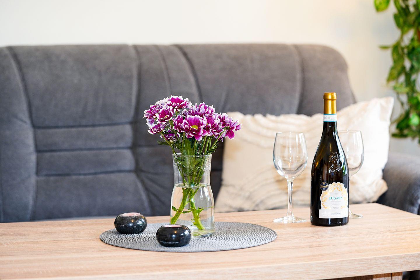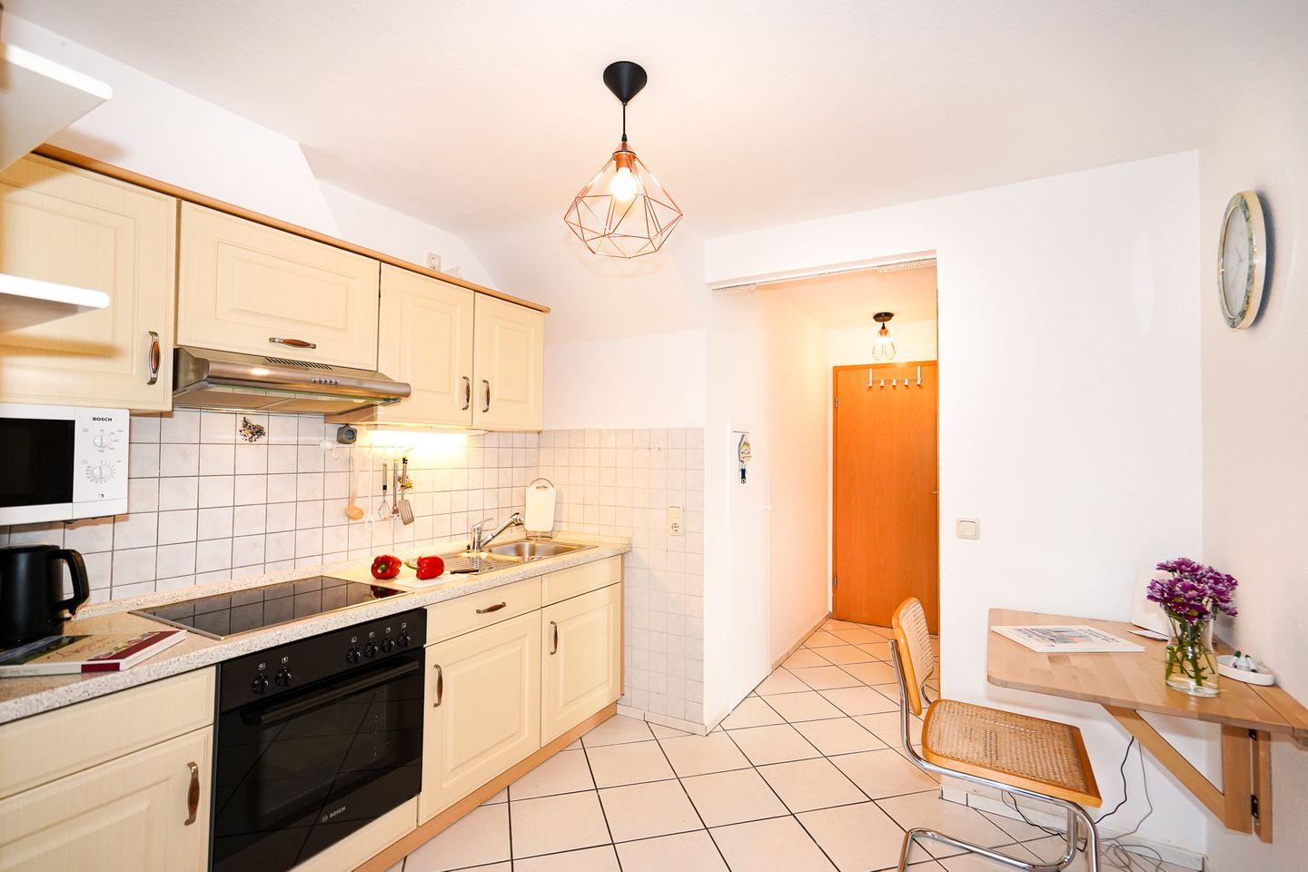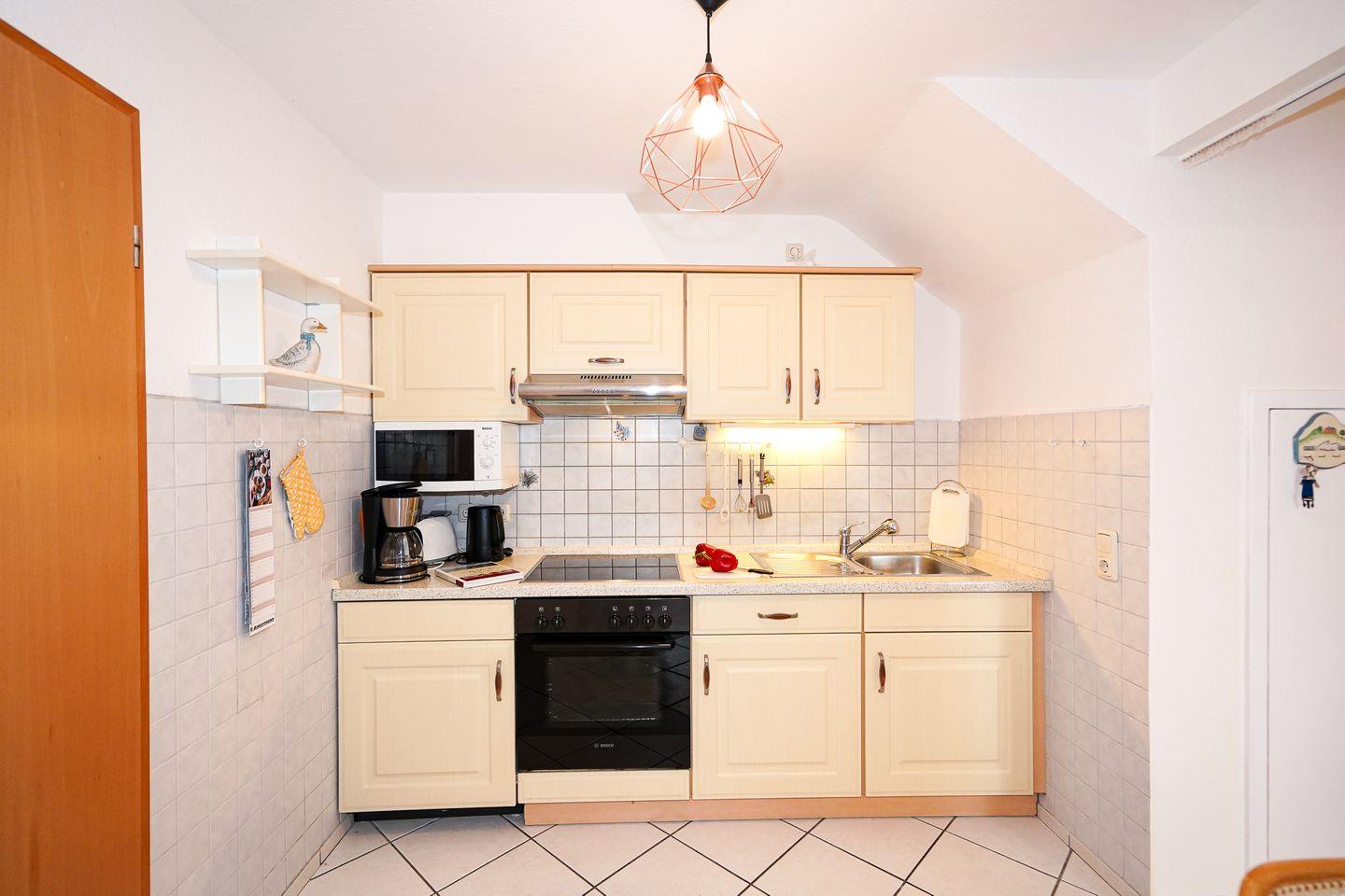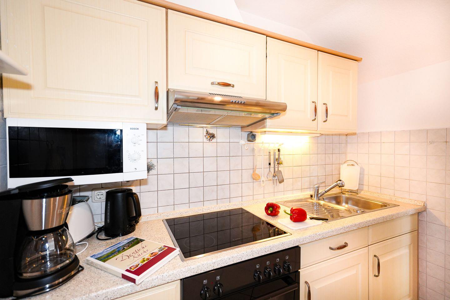 Die Kochnische ist praktisch ausgestattet und bietet Ceran-Herd, Backofen (elektrisch), Mikrowelle, Kühlschrank mit Gefrierfach (Fach im Kühlschrank) sowie Küchenutensilien, Geschirr und Besteck. Für den Start in den Tag stehen Kaffeemaschine, Wasserkocher und Toaster bereit.