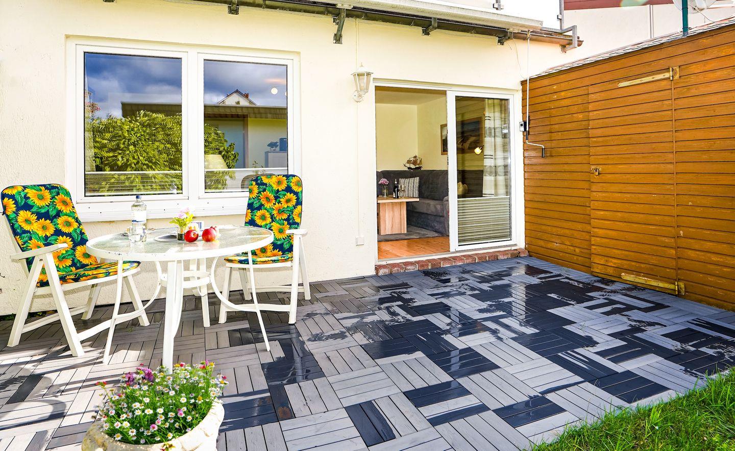 Gemütliche Ferienwohnung mit Terrasse, nur 50 m vom Strand in Grömitz, ideal für Familien und Strandliebhaber.
