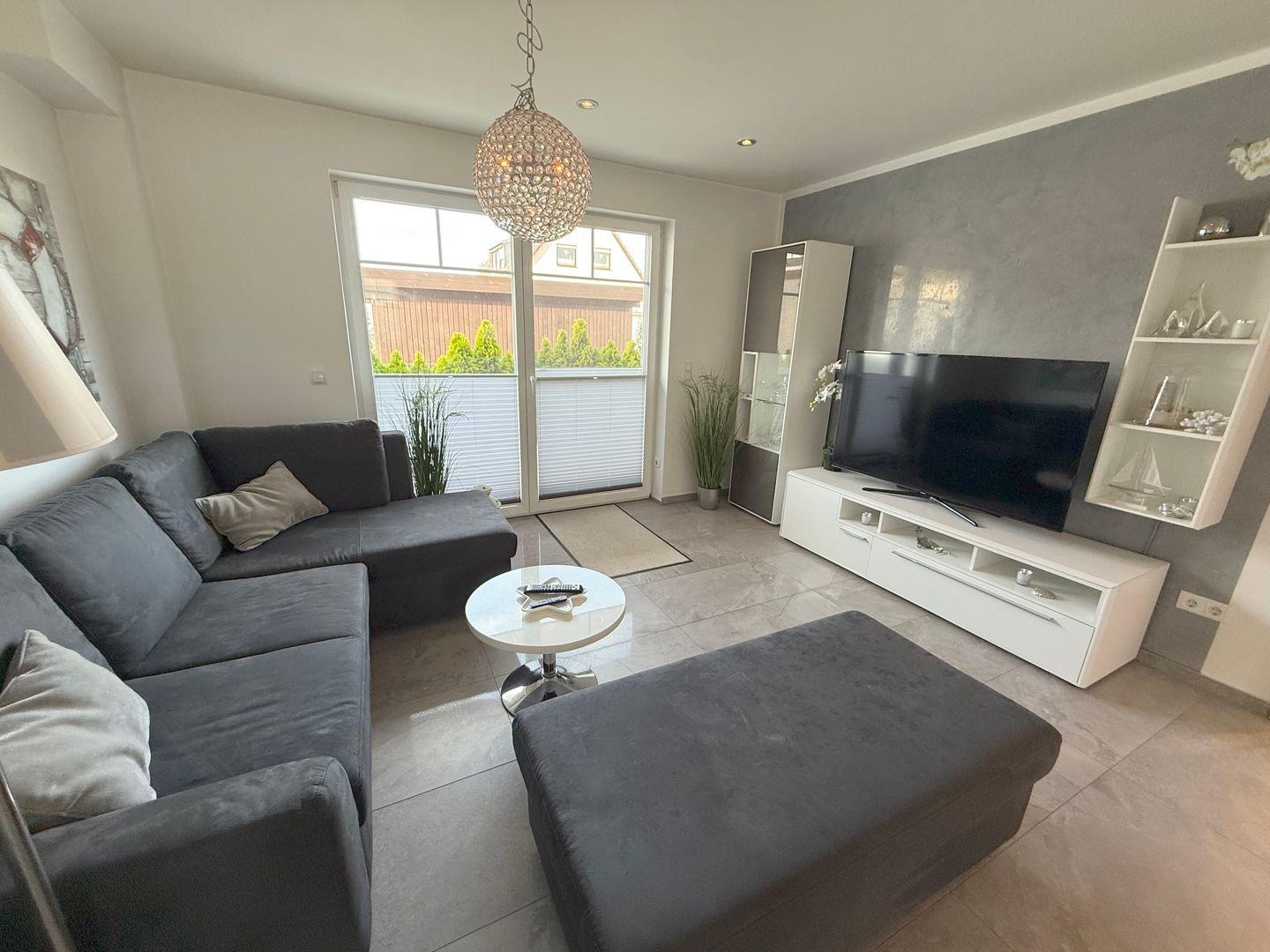 Highlight dieser barrierefreundlichen Erdgeschosswohnung ist die großzügige und nach Süd-Westen ausgerichtete Terrasse. Hier erwarten Sie ein gemütlicher Strandkorb, ein großer Esstisch, ein Gasgrill, eine elektrische Markise und außen Beleuchtung.