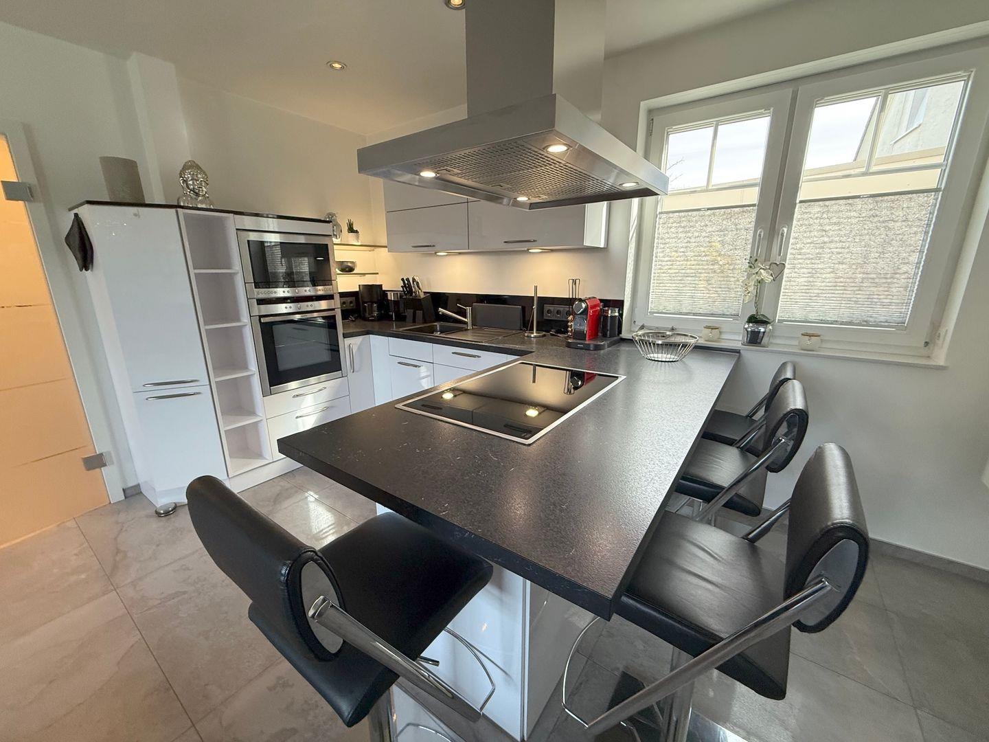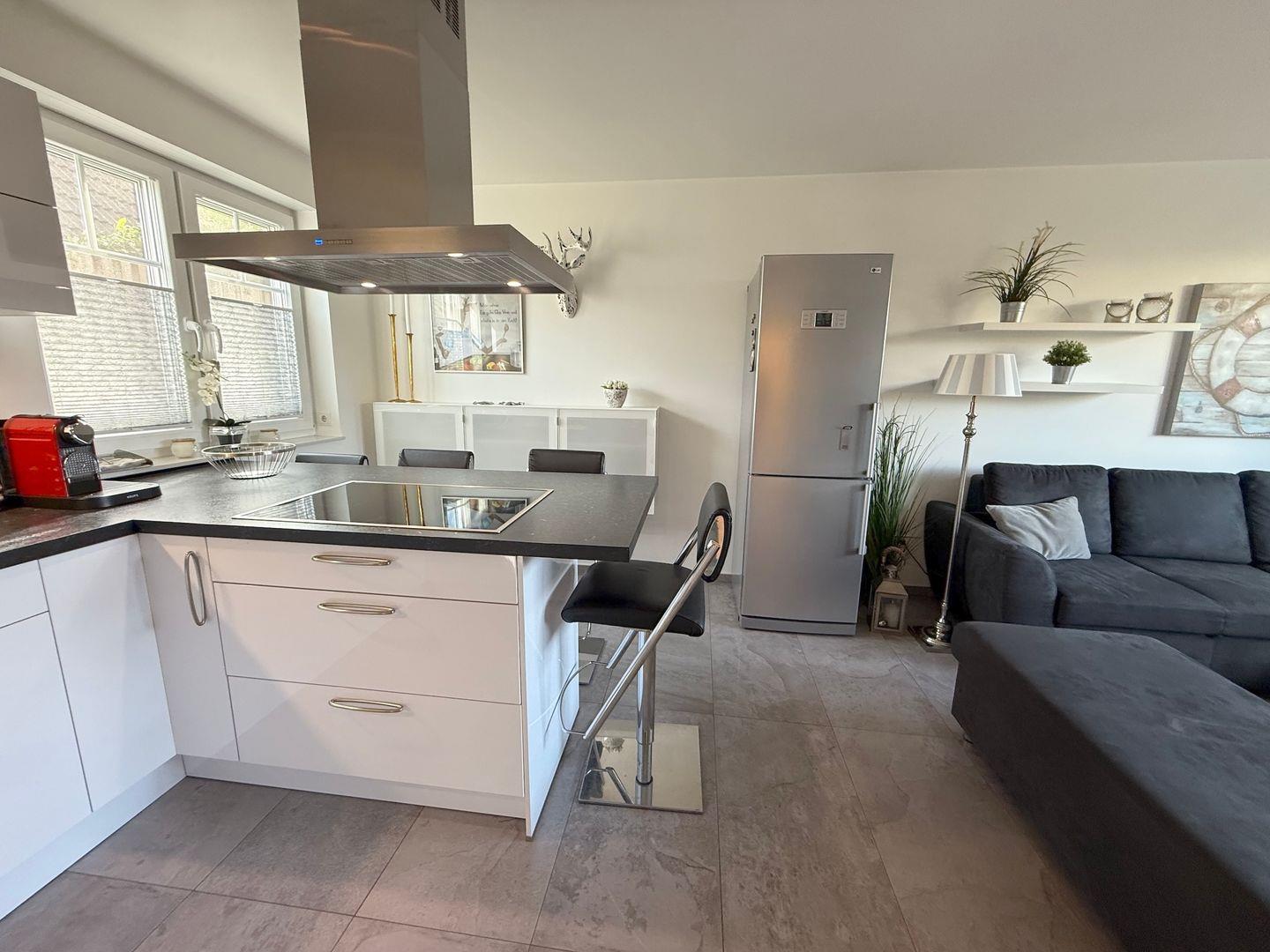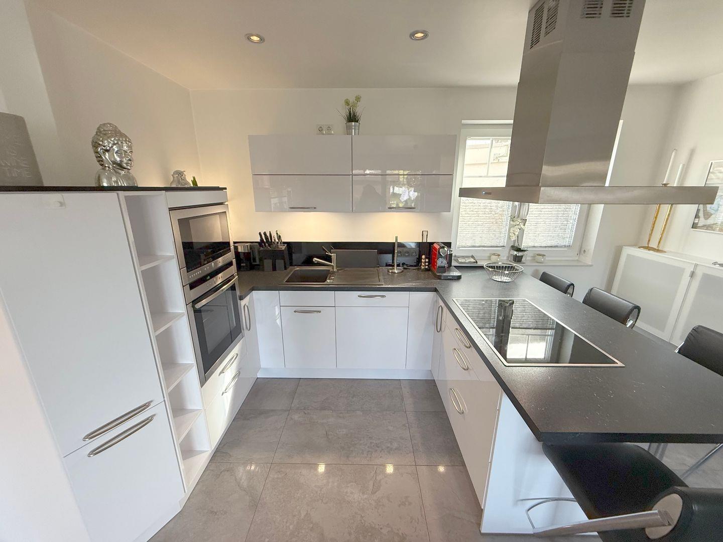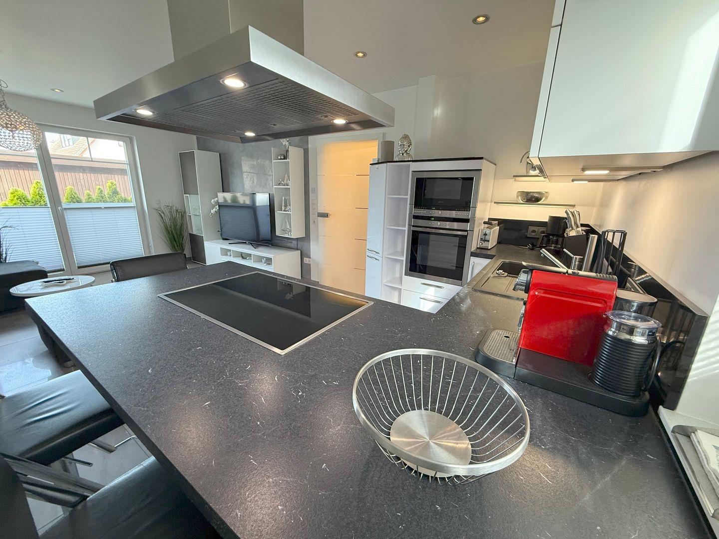 Die offen gestaltete, hochwertige Küche verfügt über eine Spülmaschine, Kühl-/ Gefrierkombination, Backofen, Induktionsherd, Mikrowelle sowie diverse Elektrokleingeräte.