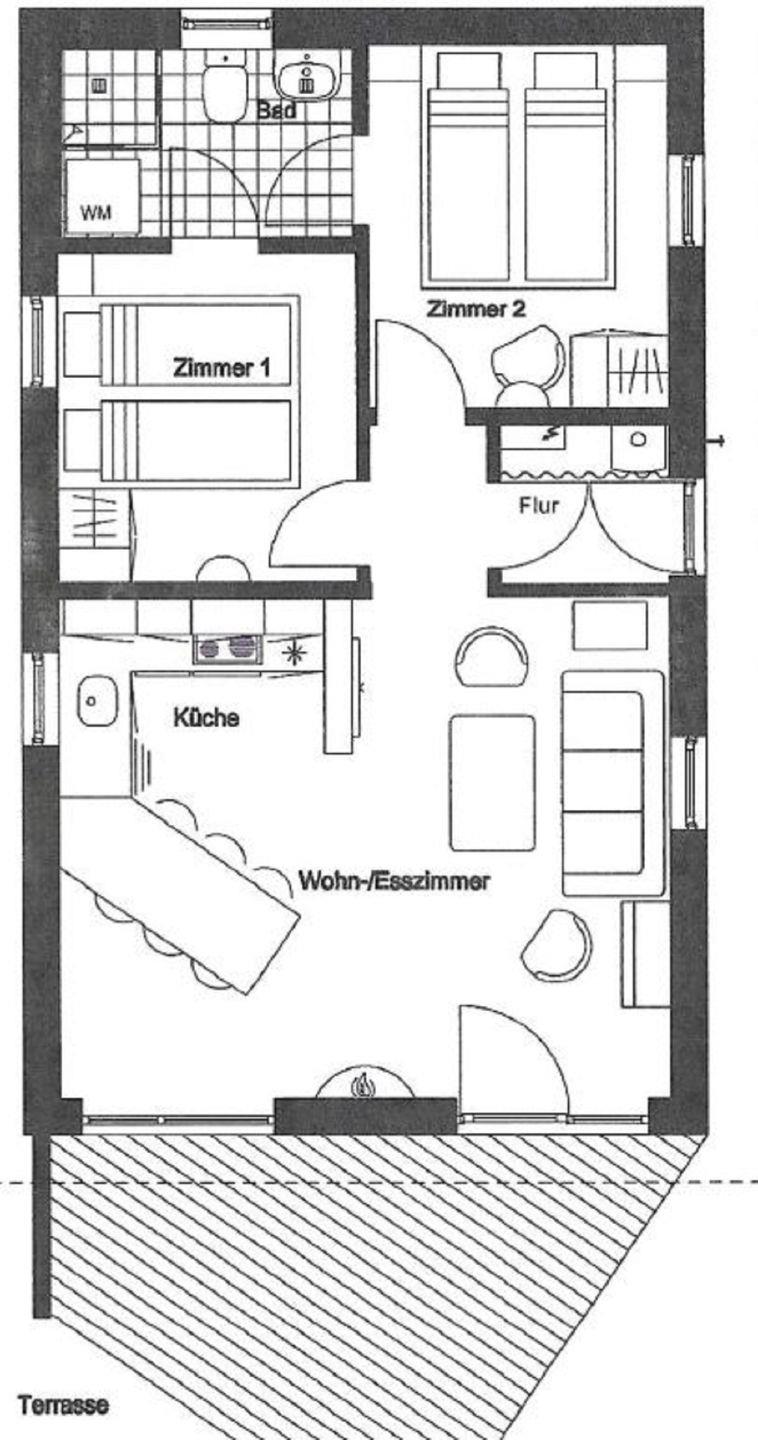 Die beiden separaten Schlafzimmer gewährleisten Privatsphäre und Ruhe. Zur weiteren Ausstattung zählen ein modernes Badezimmer mit bodengleicher Dusche, Fenster, Haartrockner und WC. Die hochwertige Küche ist offen zum Wohnbereich gestaltet und mit Ceranherd, Backofen, Geschirrspüler, Kühlschrank mit Gefrierfach, Kaffeemaschine, Wasserkocher, Toaster, Mixer sowie allen notwendigen Küchenutensilien und Geschirrhandtüchern ausgestattet. Ein Esstisch steht ebenso zur Verfügung wie ausreichend Stauraum in Kommode und Garderobe.