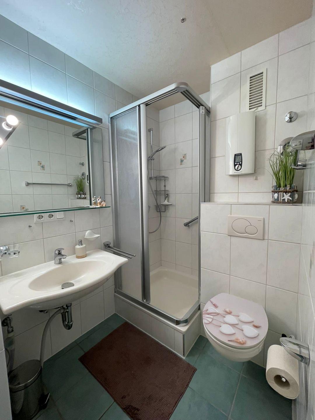 Im Badezimmer befindet sich eine Dusche, ein Waschbecken, ein WC sowie ein Spiegel. Eine eigene Waschmaschine steht Ihnen zur alleinigen Nutzung zur Verfügung. Für einen sorgenfreien Aufenthalt ist ein umfassender Sicht- und Sonnenschutz an allen Fenstern vorhanden.