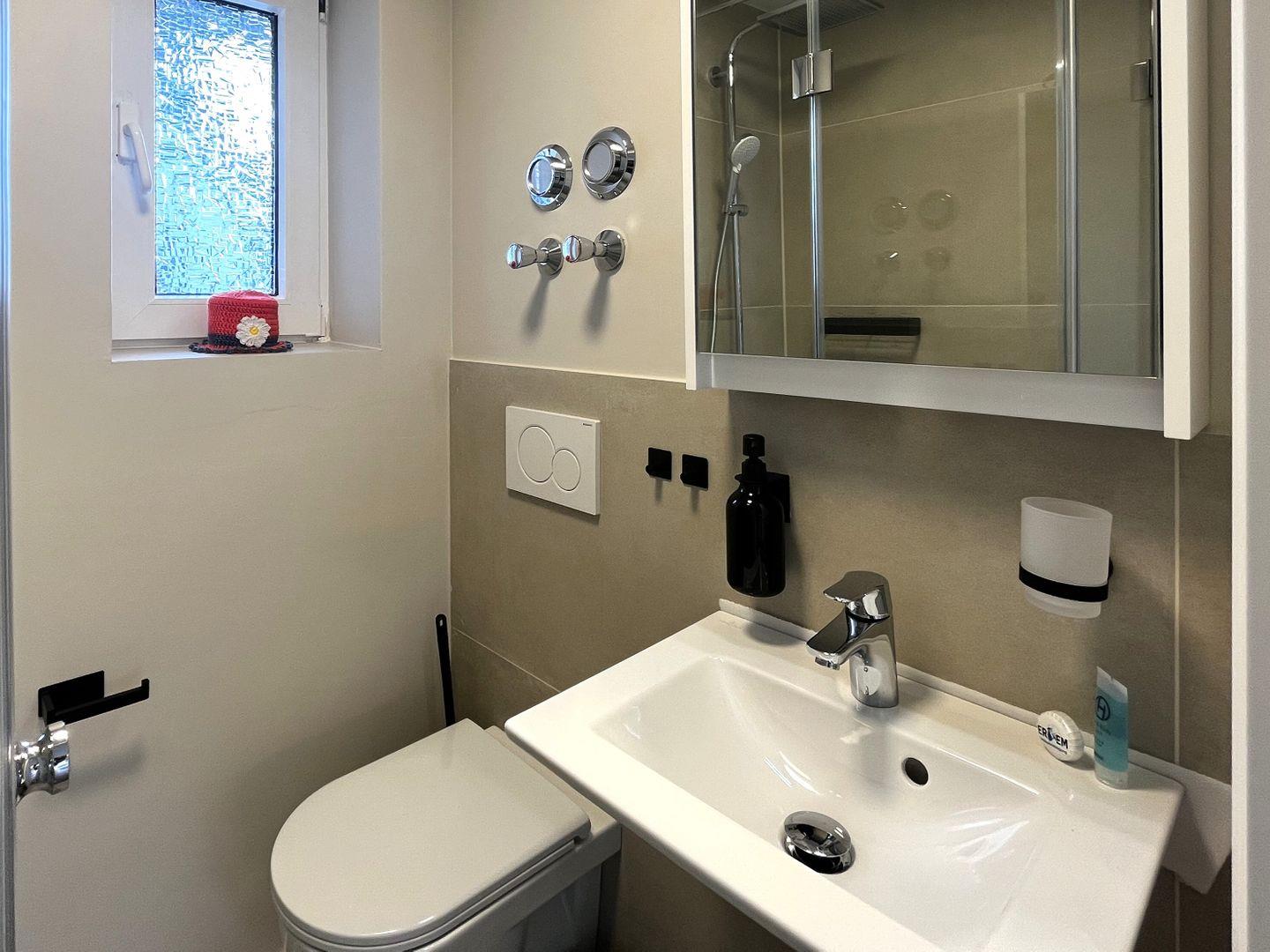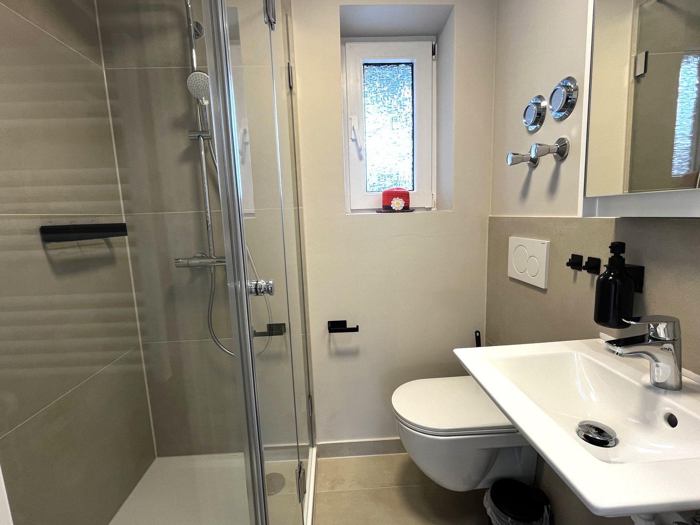 Das separate Schlafzimmer verfügt über Schlafmöglichkeiten für bis zu vier Personen (Betten mit offenem Fußende) und sorgt für eine erholsame Nachtruhe. Im Badezimmer erwartet Sie eine Dusche mit Wannenfunktion, Waschbecken, Spiegel, Haartrockner sowie ein modernes WC. Der Zugang zum Balkon eröffnet die Möglichkeit, entspannt im Freien zu sitzen – sei es beim Frühstück oder am Abend mit Blick auf die Umgebung.