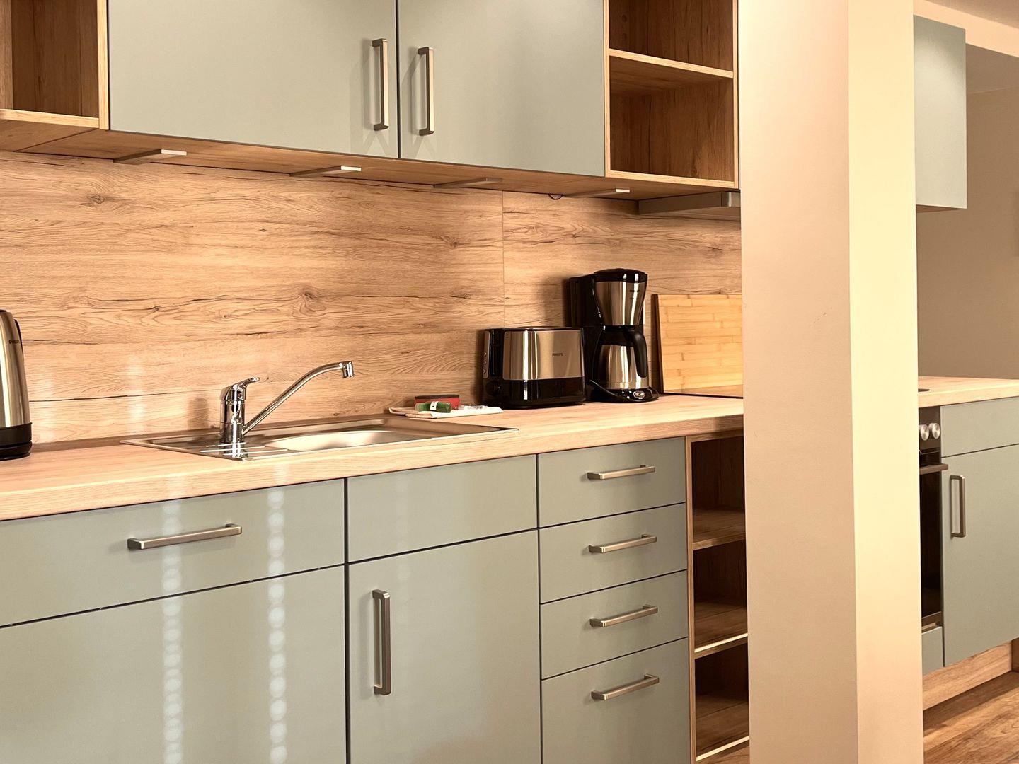Das modern ausgestattete Appartement umfasst eine offene Küche, die an den Wohnbereich angrenzt. Hier stehen Ihnen neben einem Herd und Backofen auch Kühlschrank mit Gefrierfach, Kaffeemaschine, Wasserkocher, Toaster sowie Geschirr, Besteck und Küchenutensilien zur Verfügung. Der Esstisch bildet den zentralen Treffpunkt für gemeinsame Mahlzeiten. Im gemütlichen Wohnbereich laden ein Sofa und TV zum Entspannen ein. Ein Balkon ermöglicht Ihnen entspannte Stunden im Freien – beispielsweise mit Blick in die Umgebung.
