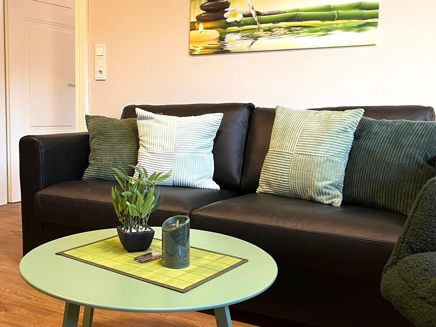 Das Appartement präsentiert sich modern und hochwertig ausgestattet. Die offene Küche geht nahtlos in das helle Wohnzimmer über und ist mit sämtlichen wichtigen Küchenutensilien ausgestattet. Dazu zählen ein Herd mit zwei Platten, Mikrowelle, Kühlschrank mit Gefrierfach, Kaffeemaschine, Wasserkocher, Toaster sowie Geschirr und Besteck. Für den Komfort auch im Alltag stehen ein Esstisch, ein gemütliches Sofa und eine Kommode zur Verfügung. Im Badezimmer erwartet Sie eine mit Wanne ausgestattete Dusche, ergänzt durch Waschbecken, Spiegel und einen Haartrockner.