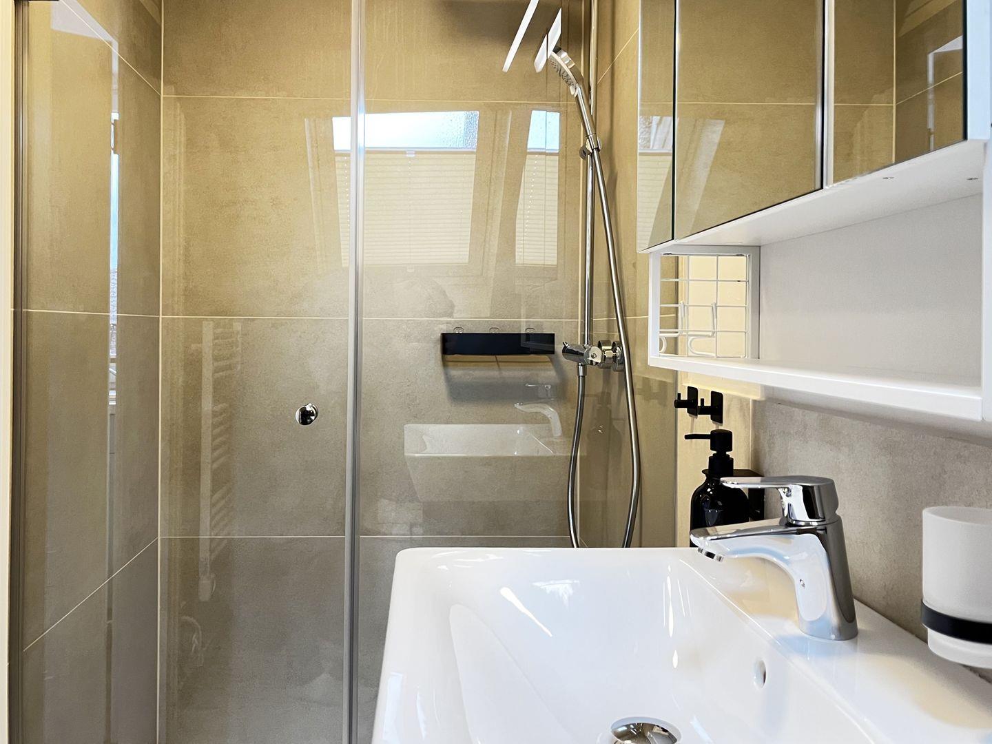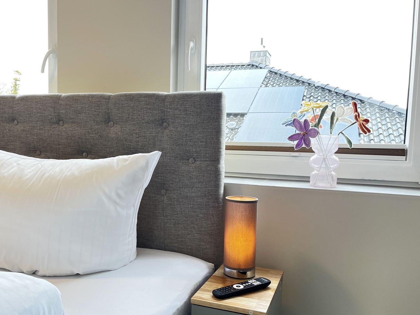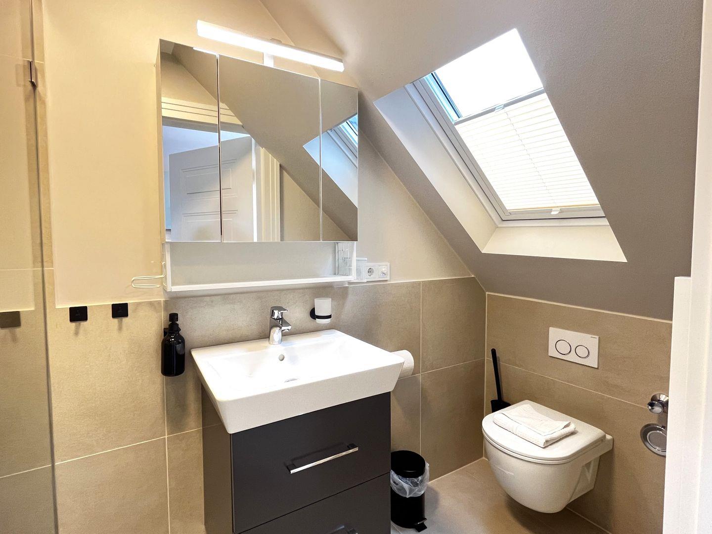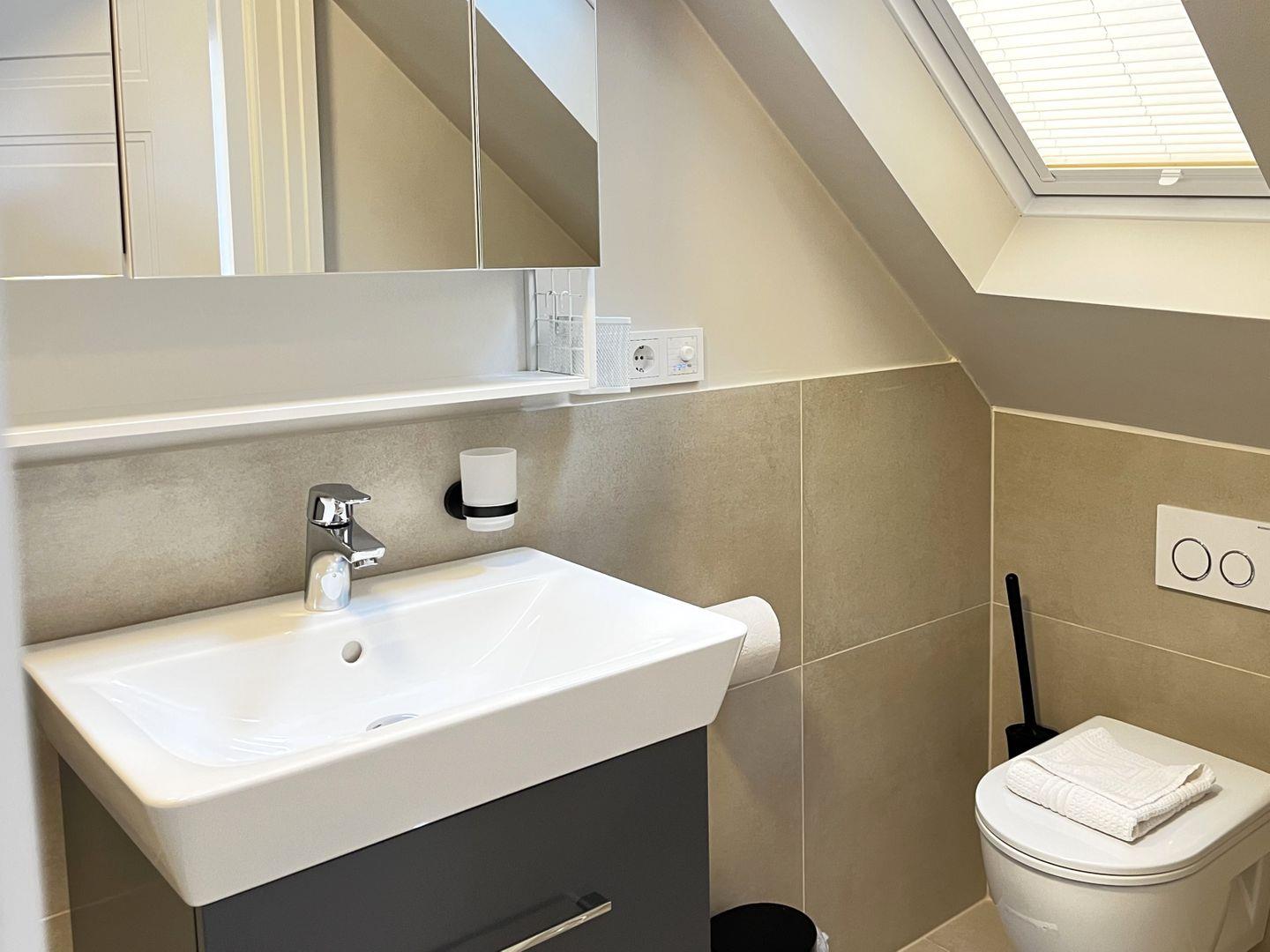 Das Badezimmer ist mit einer bodengleichen Dusche, Waschbecken, WC und Spiegel ausgestattet. Warmes Wasser, Haartrockner, Handtücher und Bettwäsche sind vorhanden, ebenso Geschirrhandtücher. Garderobe, Kommode, Abfalleimer, Rauchmelder, Zentralheizung und Sichtschutz für alle Fenster ergänzen die Ausstattung sinnvoll und sorgen für einen angenehmen Aufenthalt.