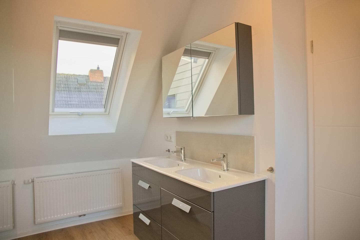 Doppelwaschtisch mit Stauraum, Spiegelschrank sowie Waschmaschine und