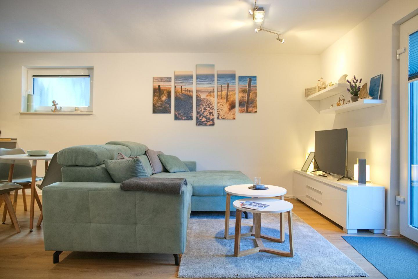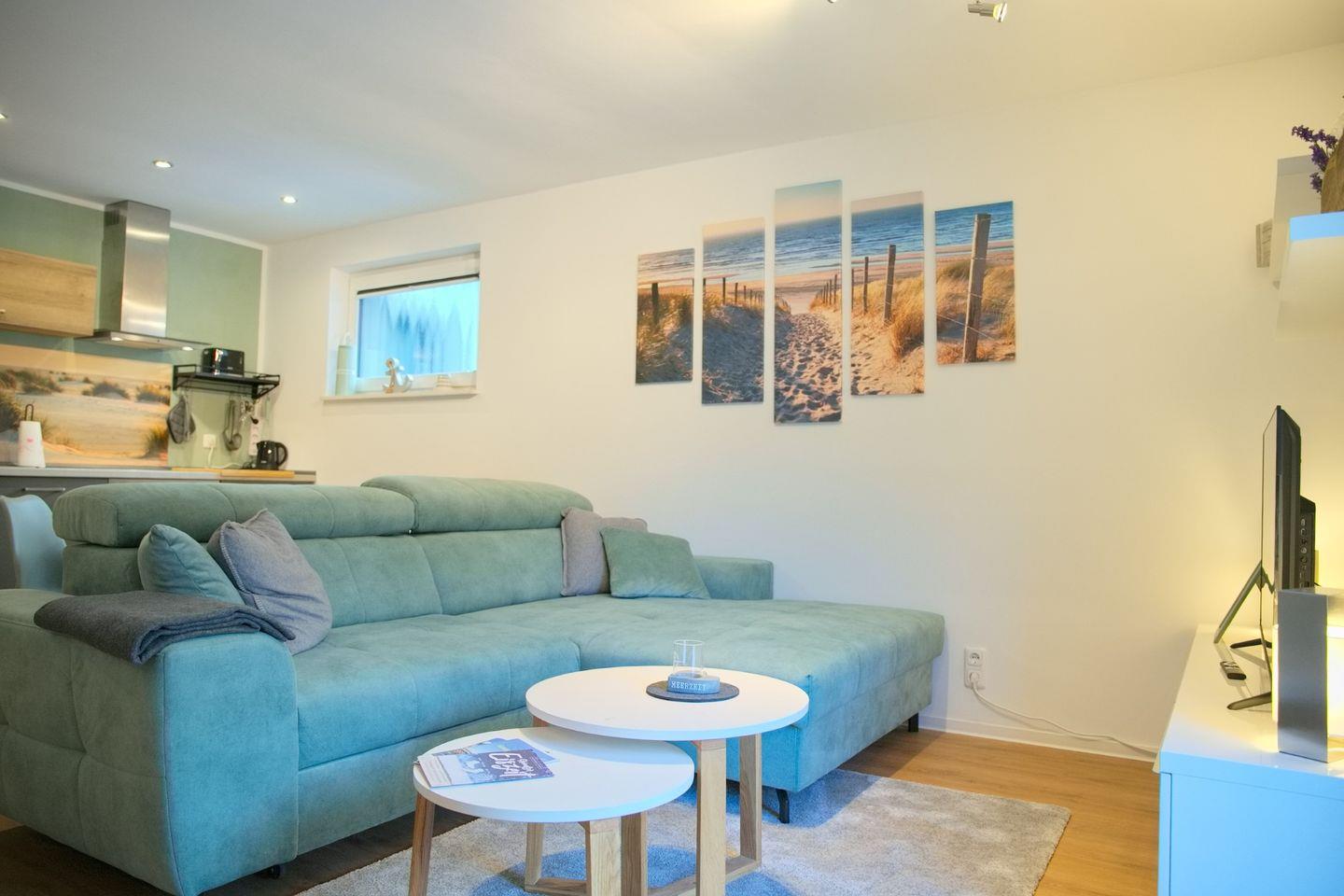 Schlafcouch, Couchtisch und Flach-TV. Der angrenzende Essbereich lädt zu