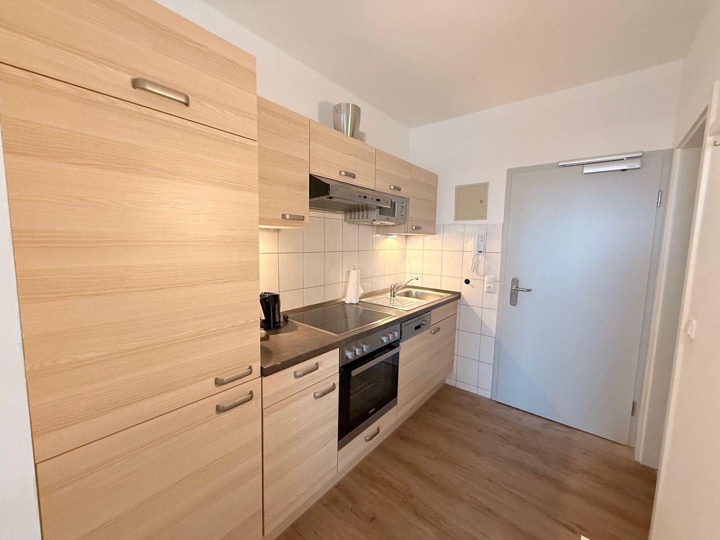 Schon beim Betreten der Wohnung wird Sie die Helligkeit und die moderne Einrichtung überzeugen. Im Eingangsbereich der Wohnung auf der rechten Seite befindet sich die gut ausgestattete Küchenzeile z. B. mit Backofen, Kühlschrank und Geschirrspüler.