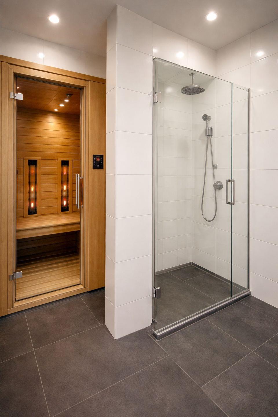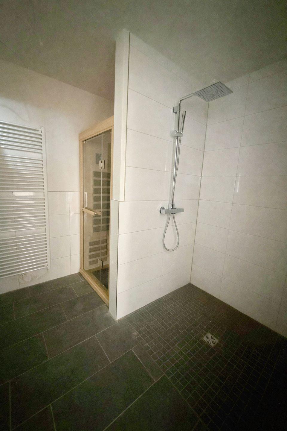 Im separaten Schlafzimmer schlafen Sie in einem großzügigen Doppelbett (180 × 200 cm) mit durchgehender Matratze. Plissees und Gardinen ermöglichen eine vollständige Verdunklung und ein erholsames Schlaferlebnis. Das moderne Badezimmer punktet mit Dusche, WC, Waschtisch sowie einer integrierten Infrarotkabine – ein echtes Highlight für entspannte Wellnessmomente nach einem Tag am Strand oder einer Radtour entlang der Küste.