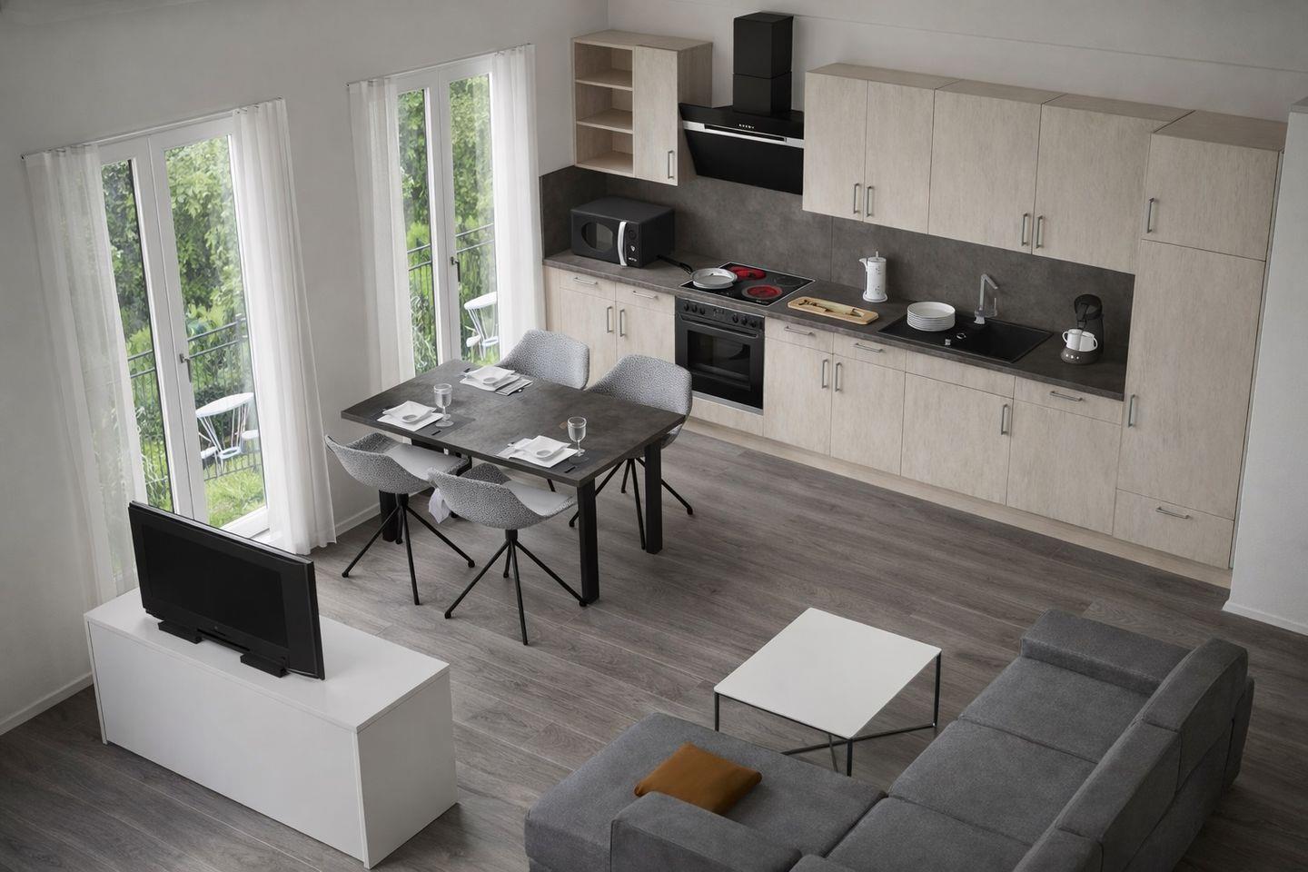 Die Wohnung bietet Platz für bis zu vier Personen und überzeugt mit einem harmonischen Raumkonzept. Im gemütlichen Wohnzimmer erwarten Sie eine komfortable Schlafcouch, ein Sessel, ein Flachbild-TV sowie praktische Verdunkelungsgardinen, die auch an sonnigen Tagen für eine angenehme Atmosphäre sorgen. Der angrenzende Essbereich lädt zu gemeinsamen Mahlzeiten und geselligen Stunden ein. Die offene Einbauküche ist vollständig ausgestattet – mit Cerankochfeld, Backofen, Geschirrspüler, Kühlschrank mit Gefrierfach, Mikrowelle und allen wichtigen Kleingeräten, sodass Sie im Urlaub auf nichts verzichten müssen.