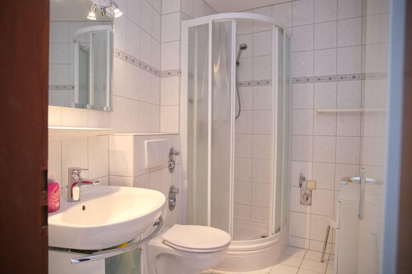 Das Badezimmer ist modern und funktional gestaltet und verfügt über eine Dusche, WC sowie einen beleuchteten Spiegel.