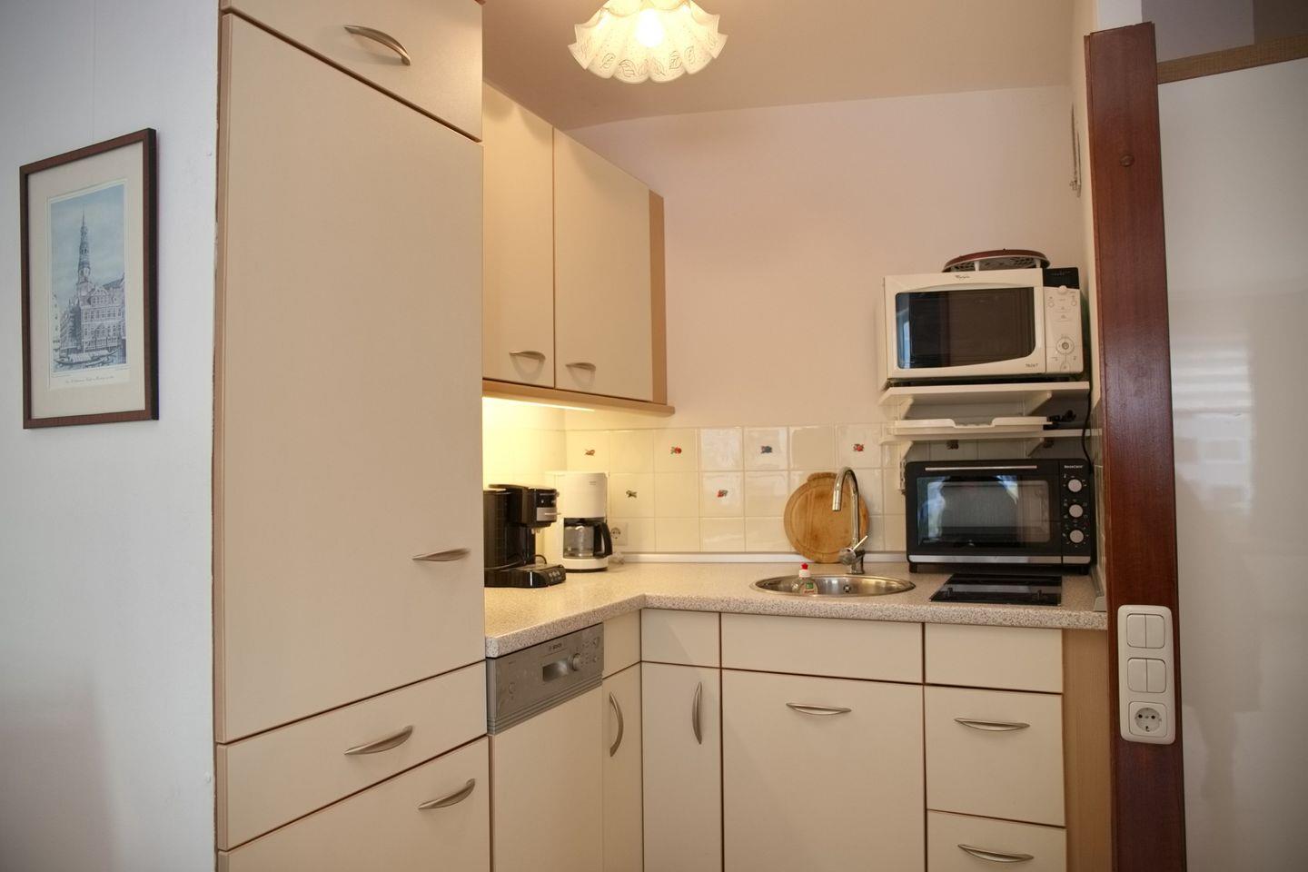Die kompakte Küche ist funktional ausgestattet und ermöglicht eine angenehme Selbstverpflegung. Zur Verfügung stehen ein 2-Platten-Cerankochfeld, ein Mini-Backofen, eine Mikrowelle mit Grillfunktion, ein Geschirrspüler sowie ein Kühlschrank mit Gefrierfach. Kaffeemaschine, Toaster und Wasserkocher ergänzen die Küchenausstattung.