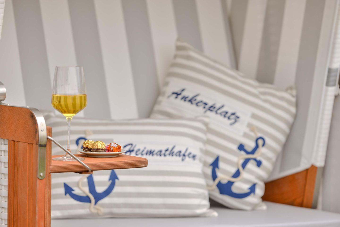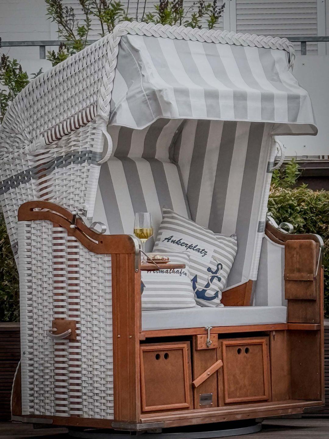Ein Highlight dieser Unterkunft ist die überdachte Terrasse mit Strandkorb und Blick ins Grüne. Die Gartenmöbel laden zum entspannten Verweilen im Freien ein. Durch den Sichtschutz an allen Fenstern genießen Sie Privatsphäre. Für Familien stehen zwei Hochstühle und zwei Babybetten bereit, sodass auch die Bedürfnisse jüngster Gäste berücksichtigt werden. Ein Gäste-WC ergänzt das komfortable Badezimmerangebot.