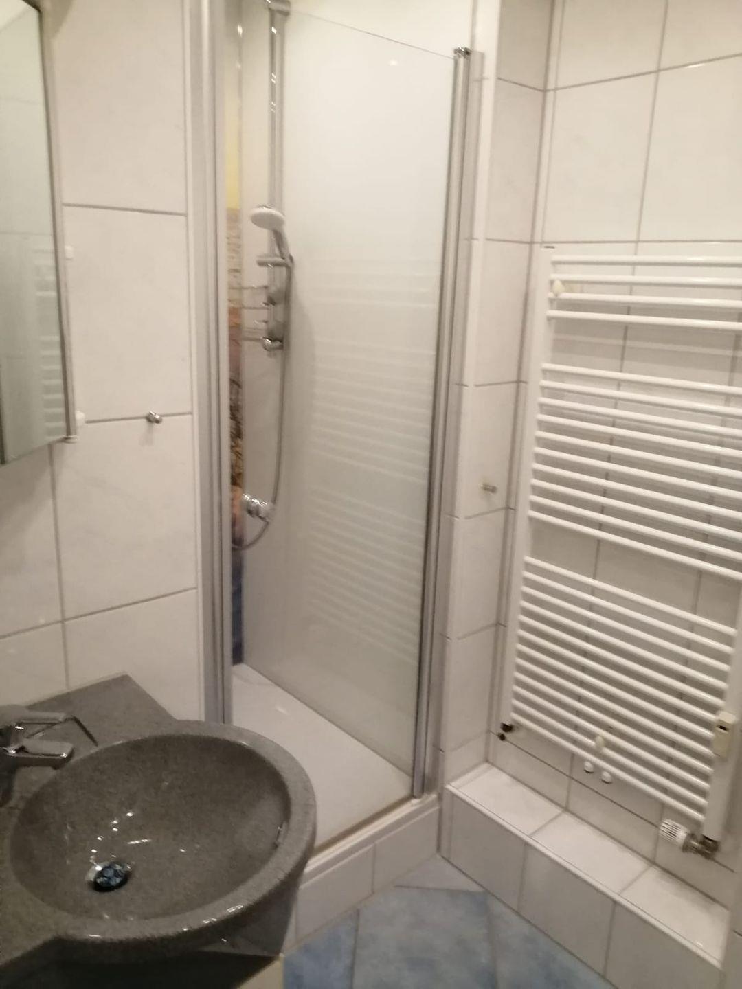 Das moderne Badezimmer überzeugt mit einer Dusche, WC, Waschbecken, Spiegelschrank, Föhn und Vergrößerungsspiegel. Die gesamte Wohnung ist mit pflegeleichtem Laminatboden ausgelegt und somit besonders gut für Allergiker geeignet.