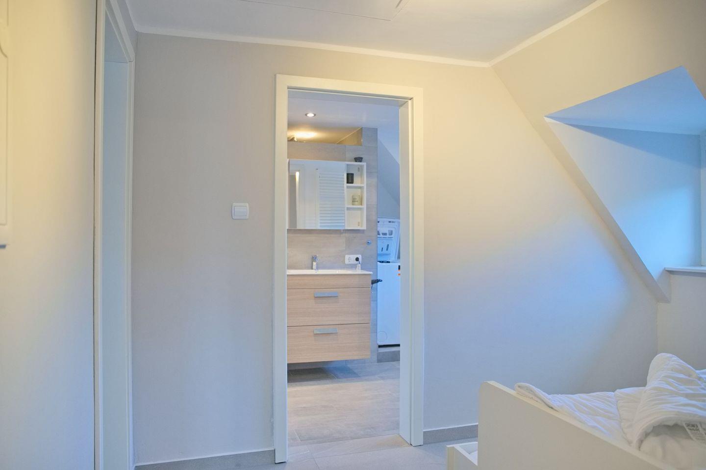 Das moderne Badezimmer sorgt mit seiner großen Walk-In-Dusche für einen frischen Start in den Tag oder wohltuende Erholung am Abend. Waschmaschine und Trockner stehen dir selbstverständlich zur Eigennutzung zur Verfügung – besonders angenehm bei längeren Aufenthalten.