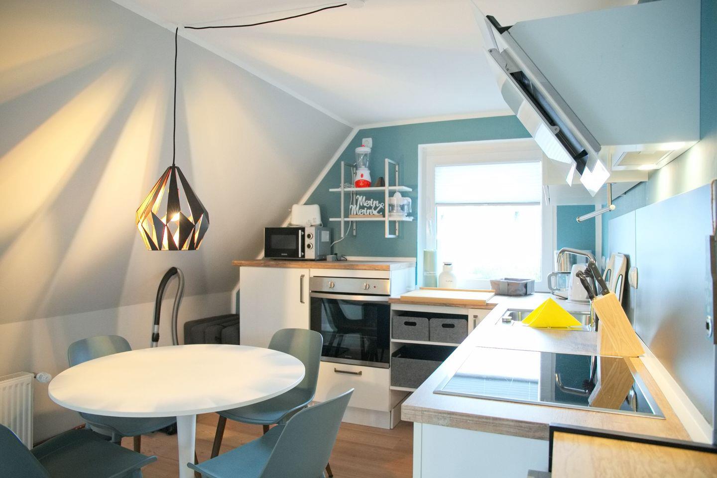 In der offenen, voll ausgestatteten Einbauküche findest du alles, was du brauchst, um dich auch im Urlaub ganz zuhause zu fühlen: Ceranfeld, Backofen, Mikrowelle, Geschirrspüler, Kühl-Gefrierkombination sowie Kaffeemaschine, Wasserkocher und Toaster. Ob schneller Kaffee am Morgen oder gemeinsames Kochen – hier entsteht Genuss ganz ohne Aufwand.