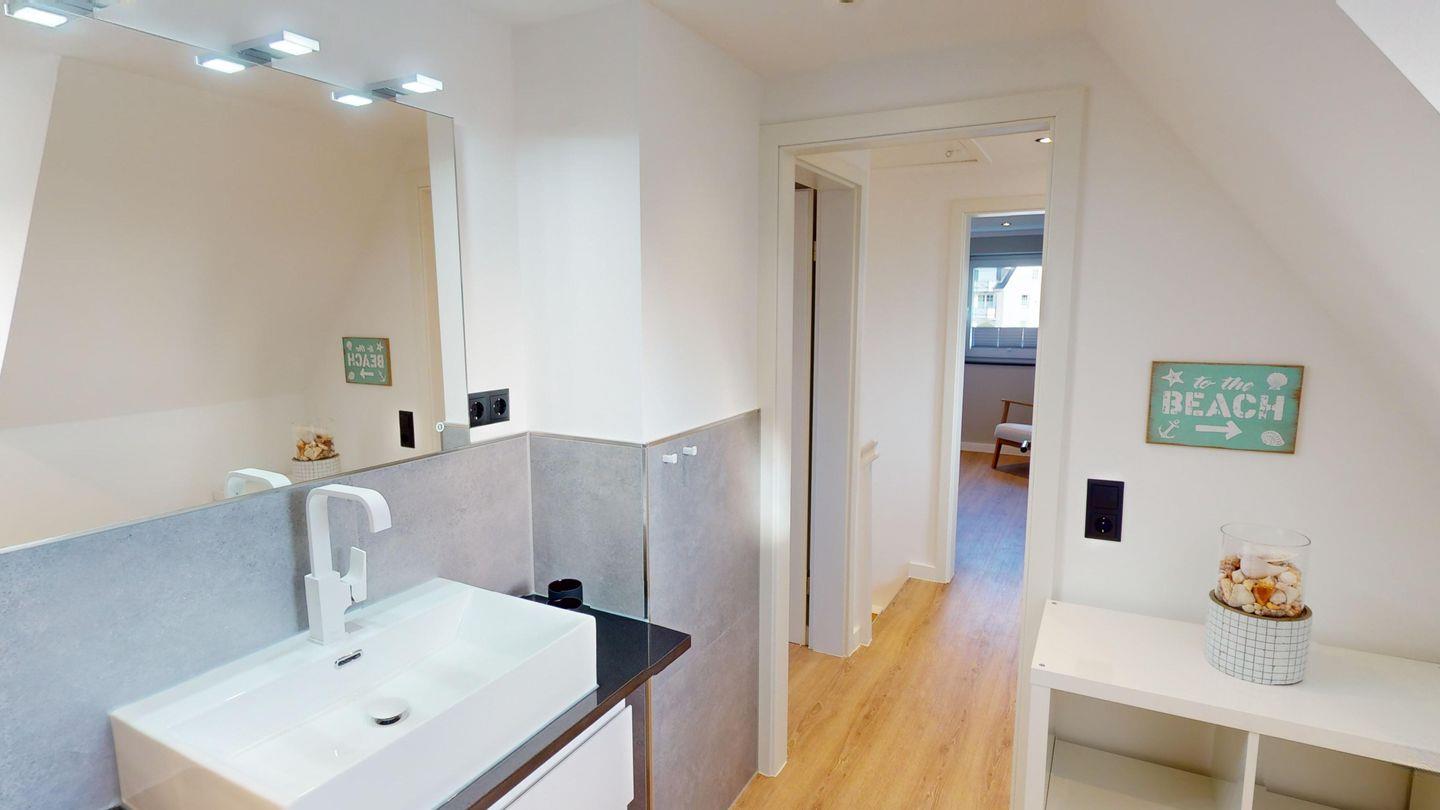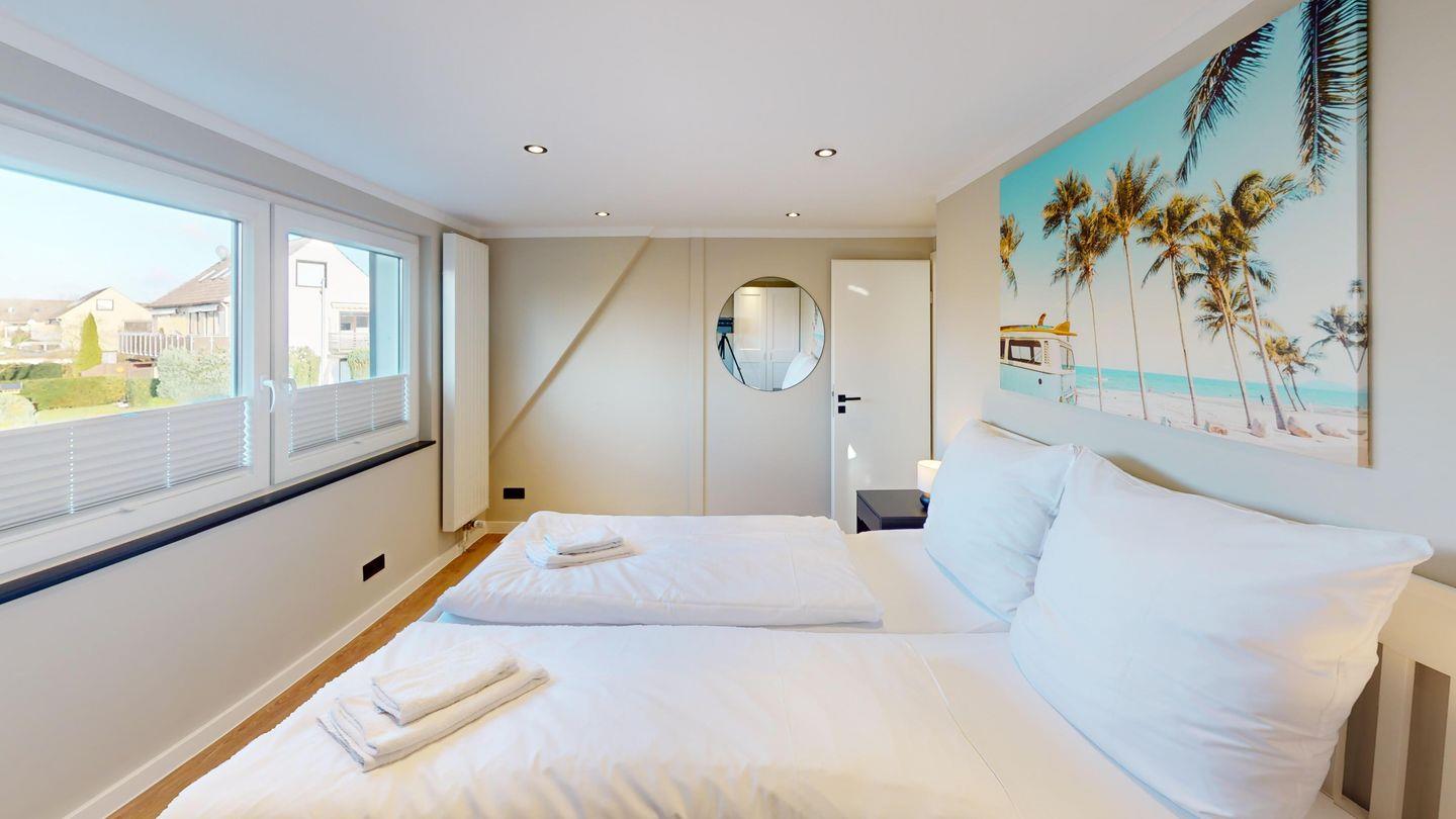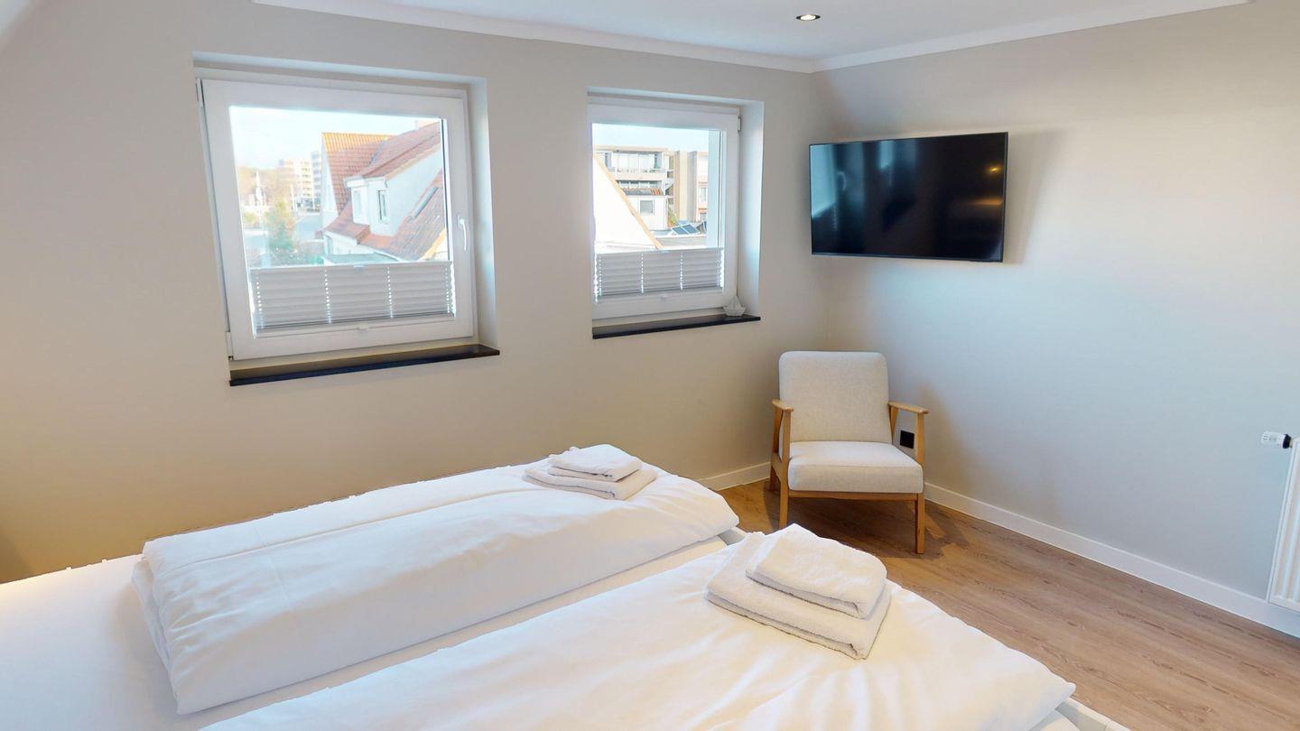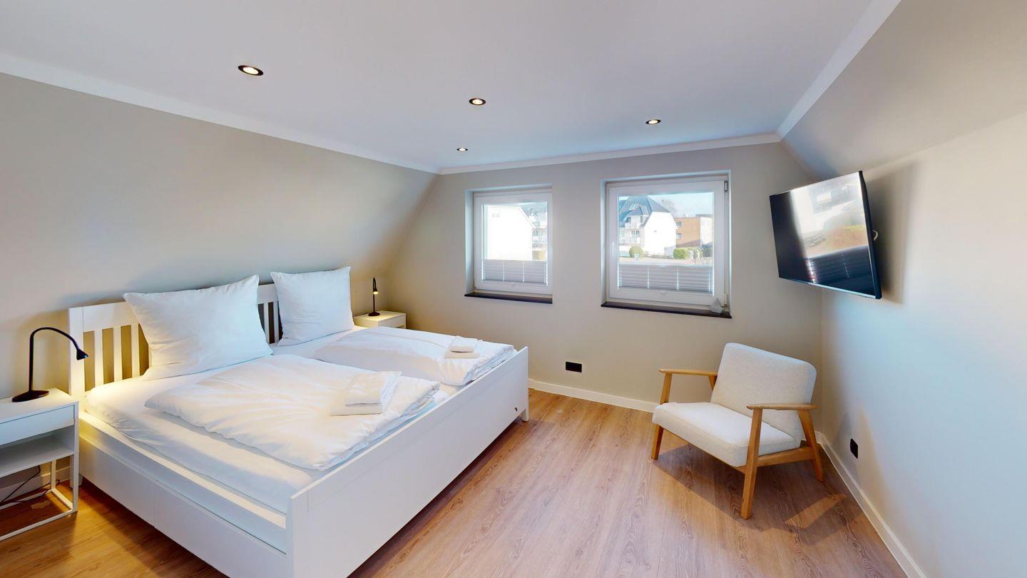 Im Obergeschoss befinden sich zwei weitere Schlafzimmer mit komfortablen Doppelbetten – ideal für erholsame Nächte. Eines der Zimmer ist ebenfalls mit einem Fernseher ausgestattet. Ein weiteres modernes Duschbad sowie ein zusätzliches Gäste-WC sorgen auch hier für angenehmen Komfort. Verdunklungsplissees in allen Schlafzimmern schaffen beste Voraussetzungen für einen ruhigen Schlaf.