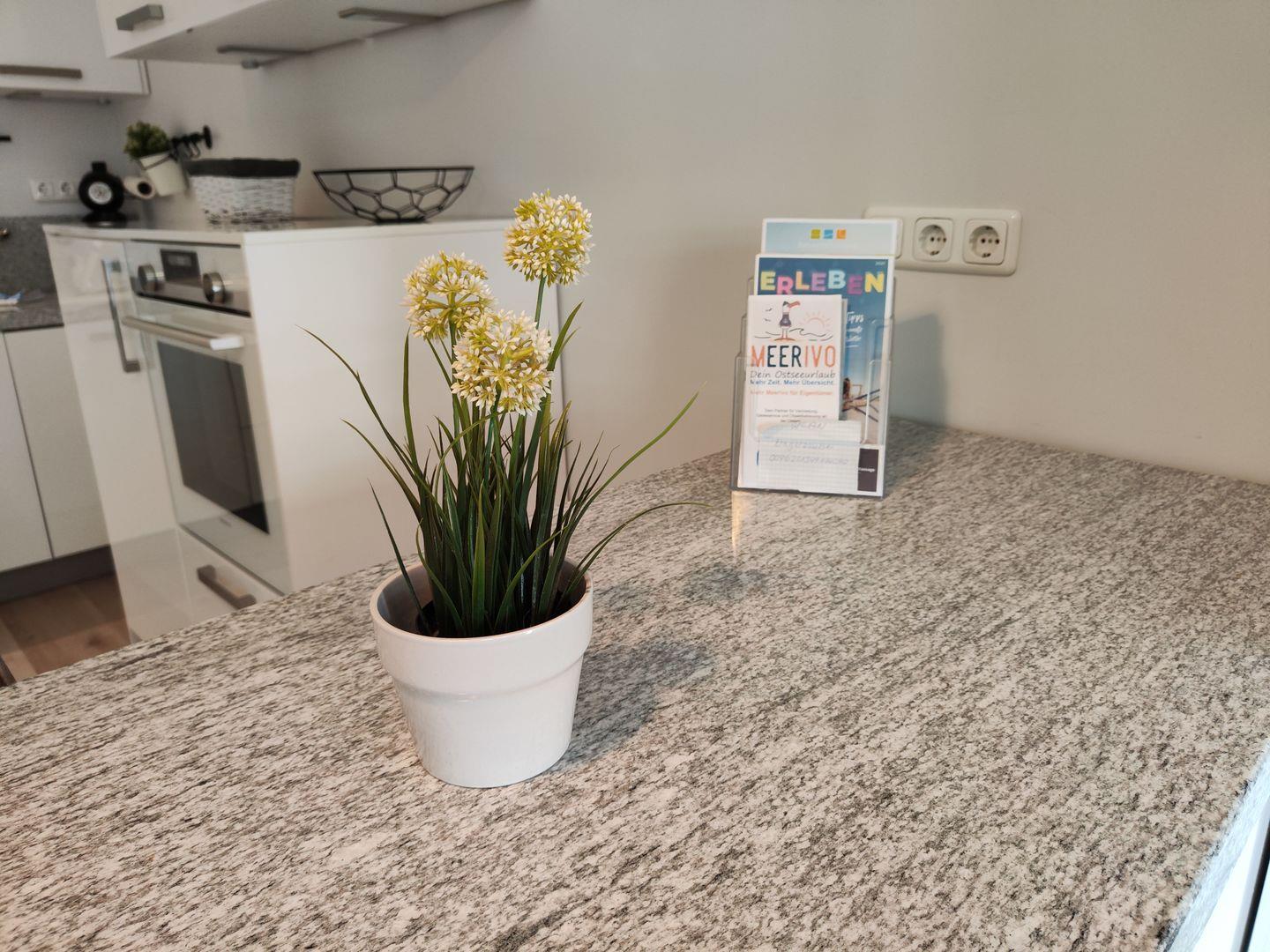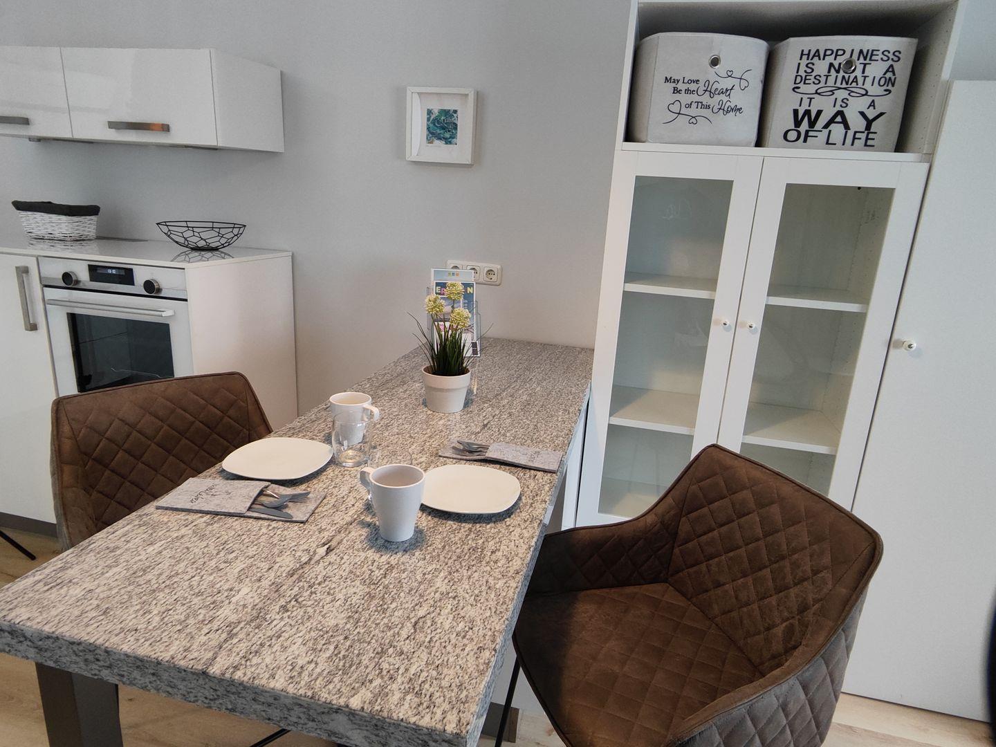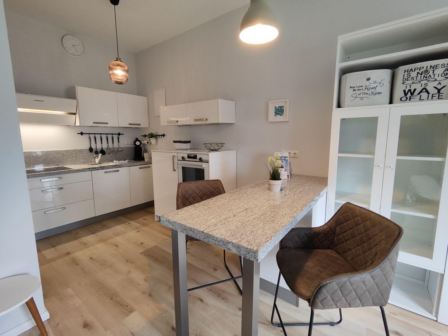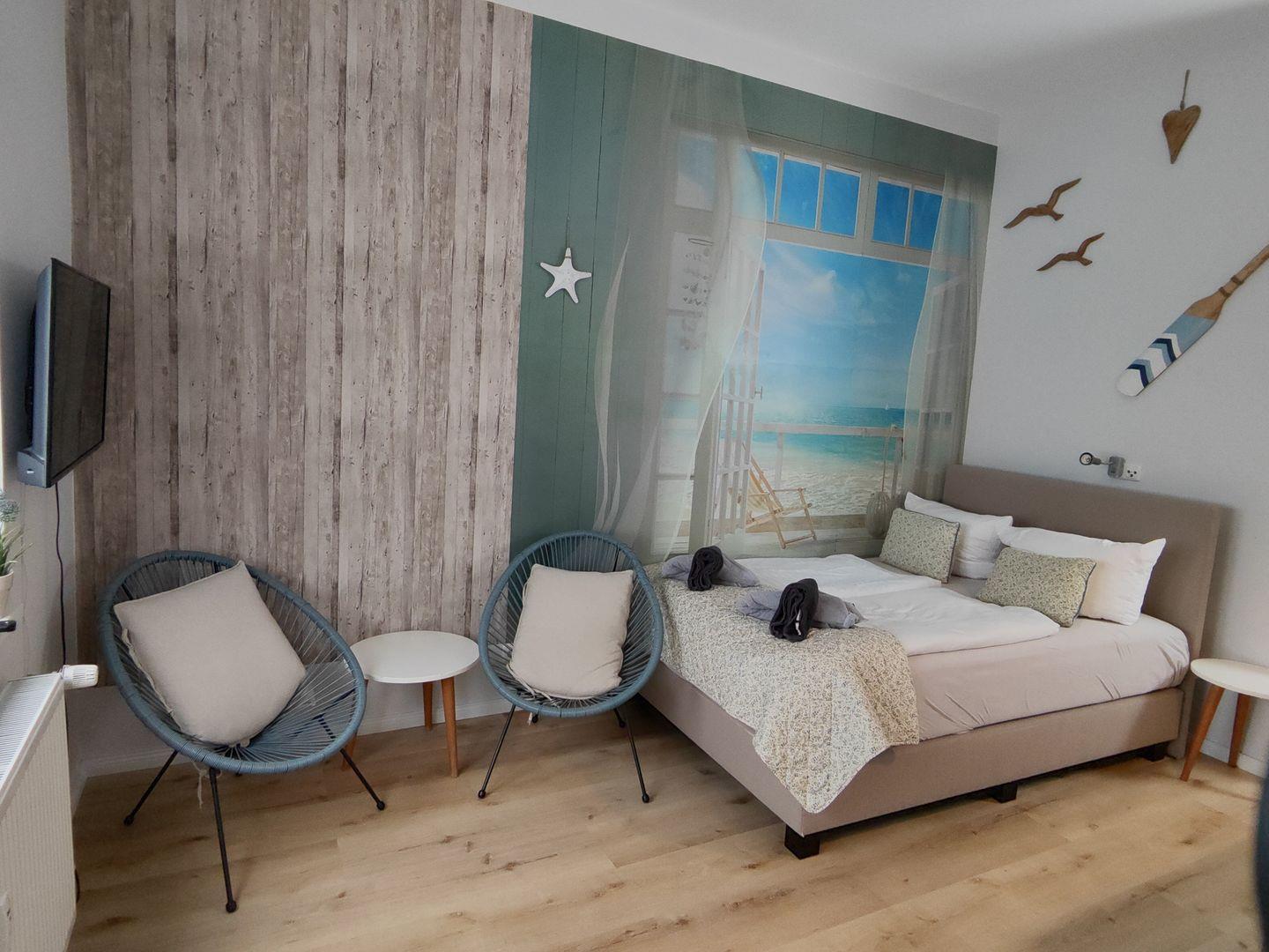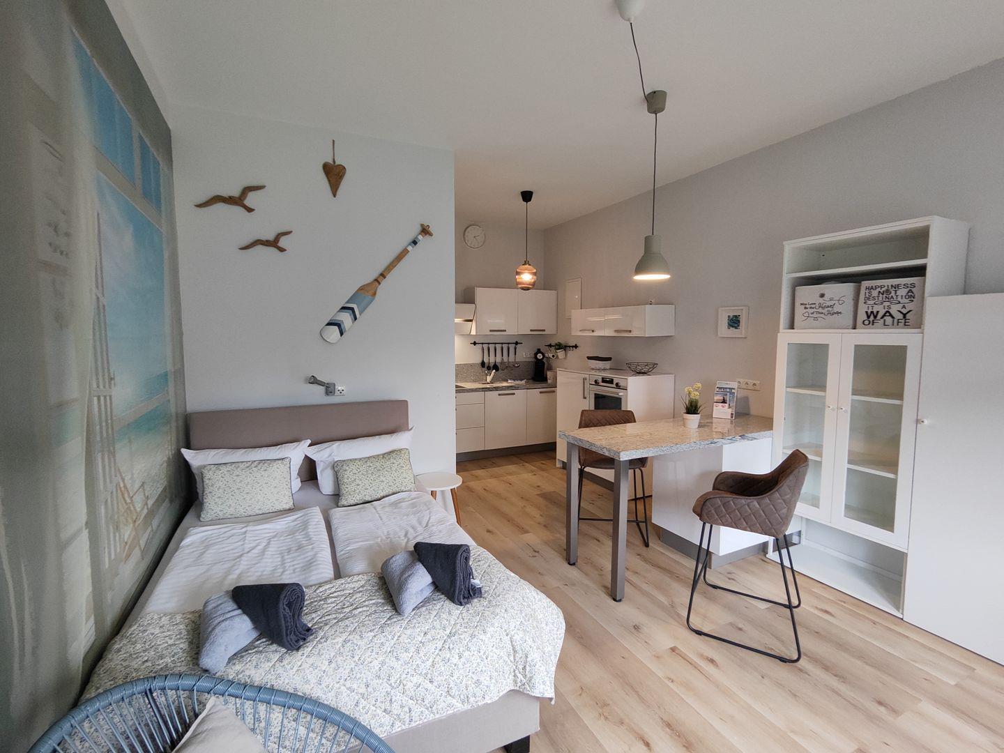 Die integrierte Küchenzeile ist ideal für deine Selbstversorgung ausgestattet und wird durch eine gemütliche Essecke ergänzt. Das komfortable Doppelbett sorgt für erholsame Nächte nach einem Tag am Meer. Das Badezimmer ist funktional und modern gestaltet.