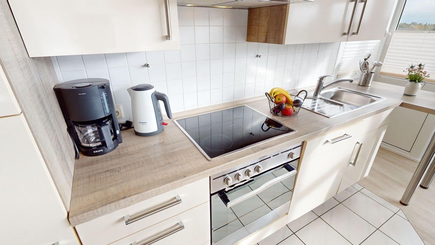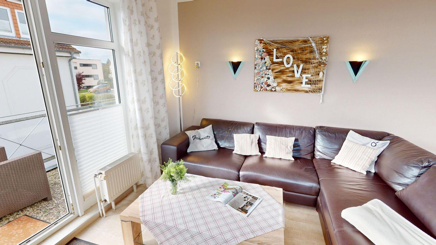 Im Anschluss an den Wohn-/Essbereich mit offener, schicker Küche liegt der möblierte Balkon mit Strandkorb, wo Sie entspannte Stunden verbringen können.