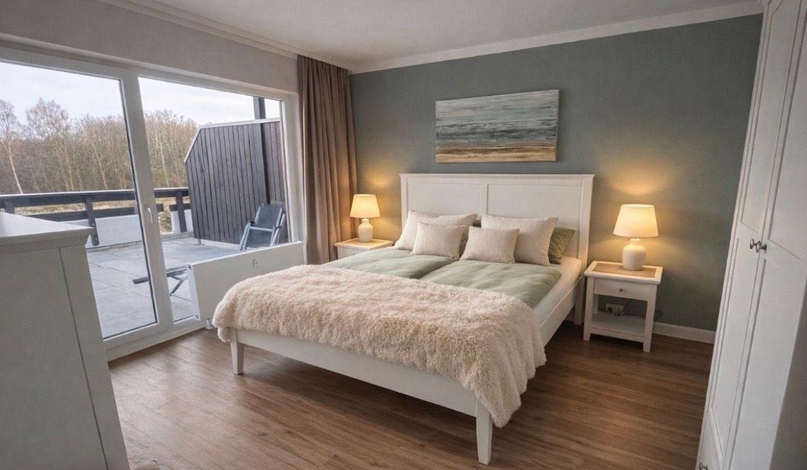 Vom Schlafzimmer, mit einem Doppelbett und Kleiderschrank, gelangen Sie, ebenso wie vom Wohnzimmer, auf die ca. 32 m² große Dachterrasse mit Gartenmöbeln.
