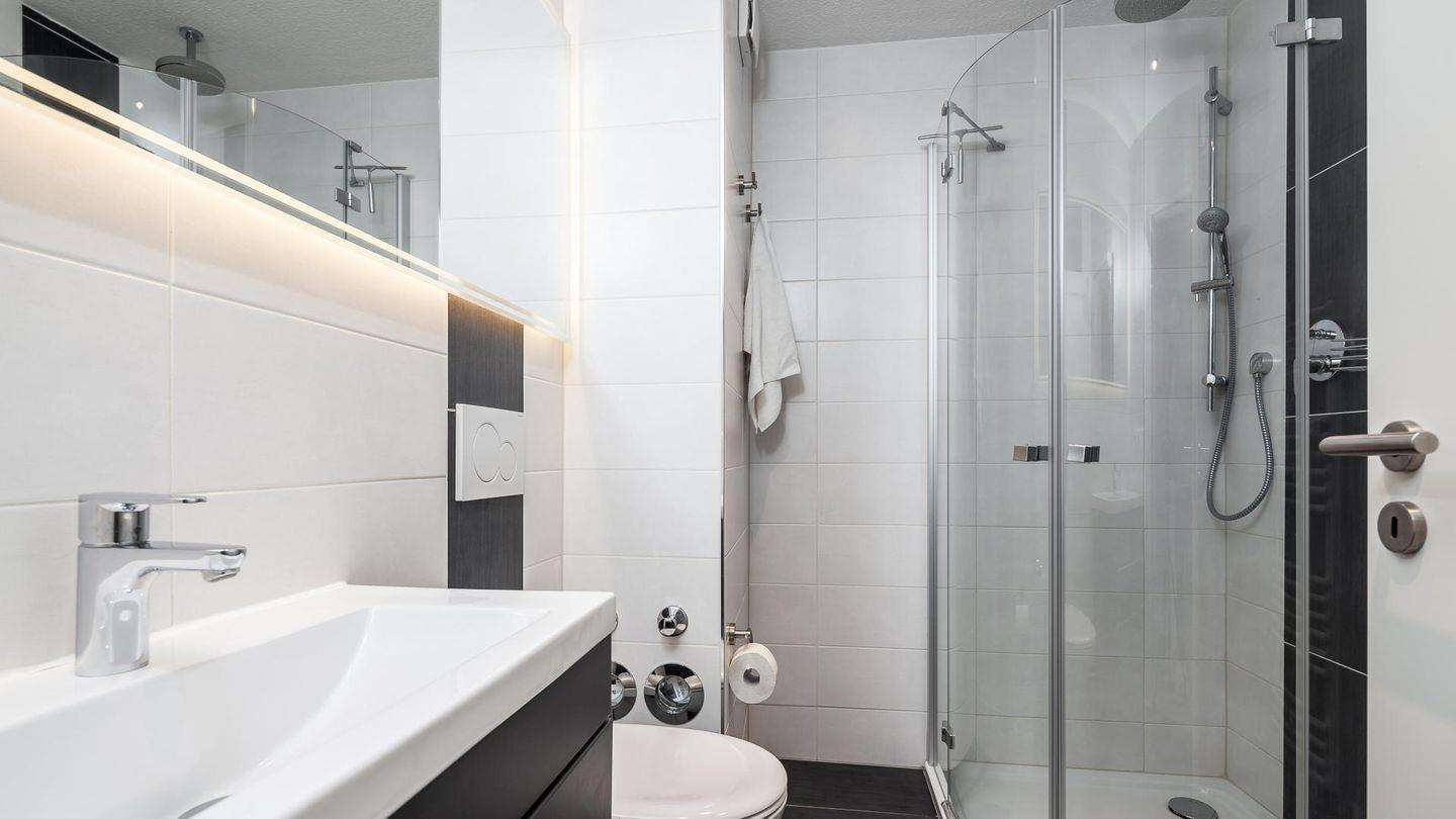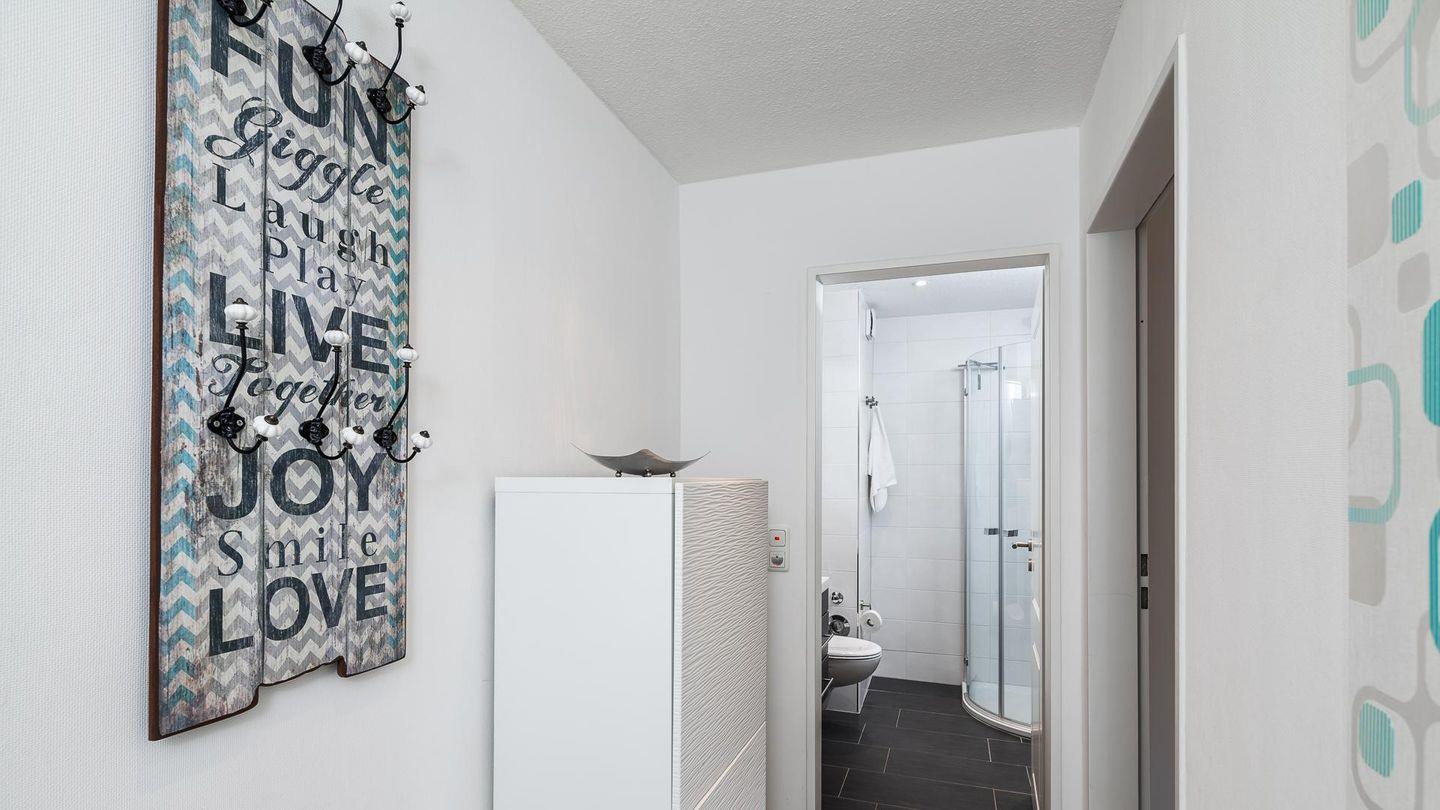 Das Duschbad mit seiner bodentiefen Dusche ist hell/ braun gefliest und bietet genug Platz für die persönlichen Dinge.