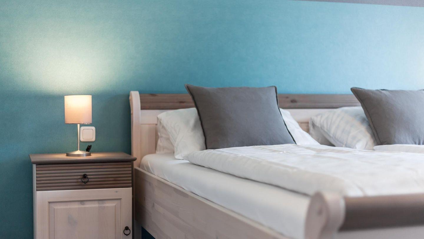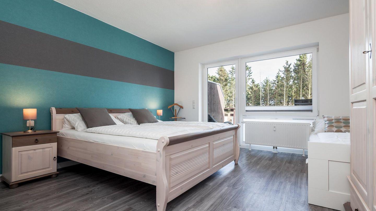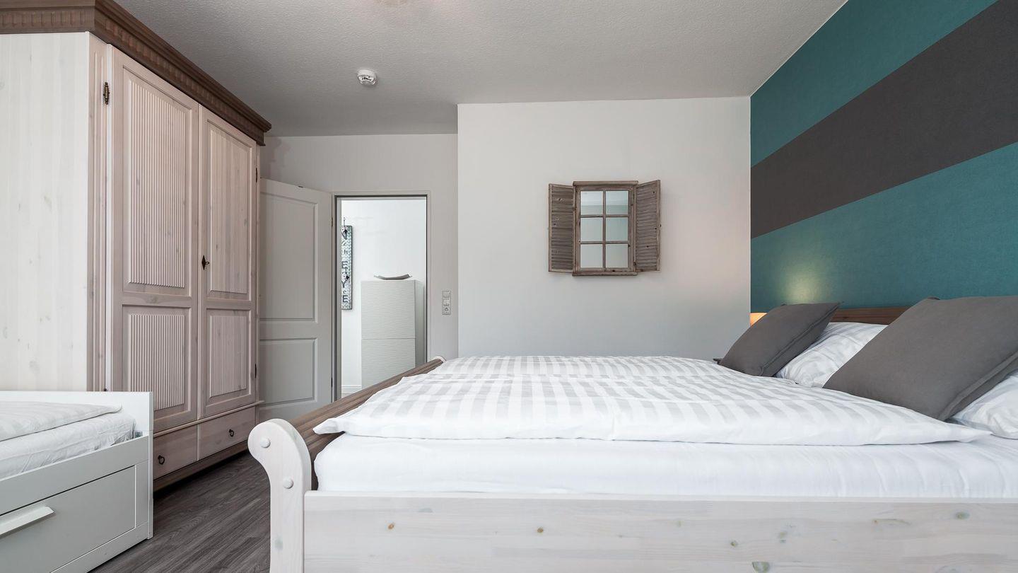 Vom Schlafzimmer, mit einem Doppelbett, Gästebett (1 Person) und Kleiderschrank, gelangen Sie, ebenso wie vom Wohnzimmer, auf die ca. 34 m² große Dachterrasse mit Gartenmöbeln.