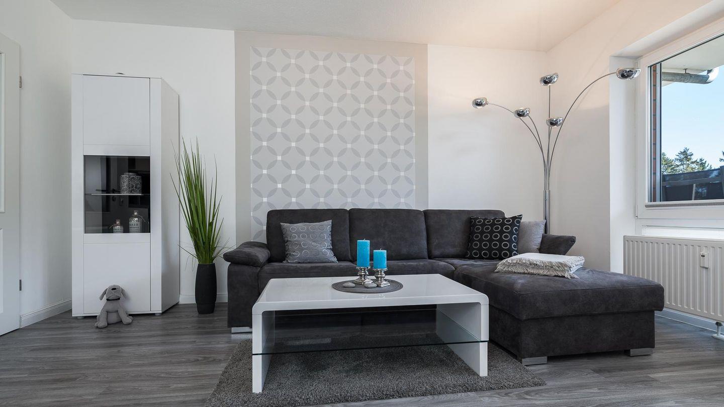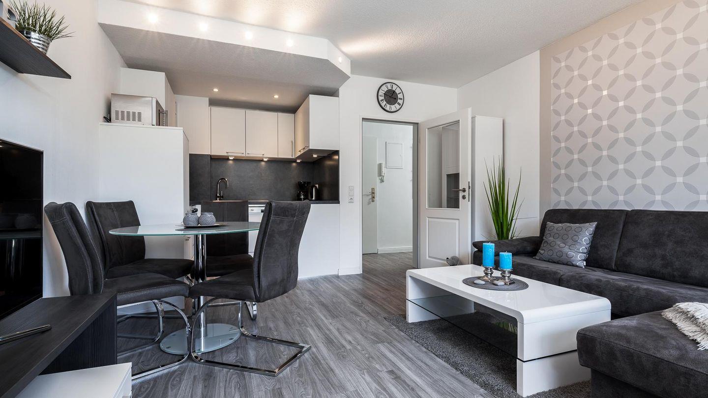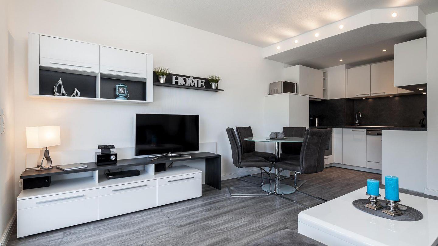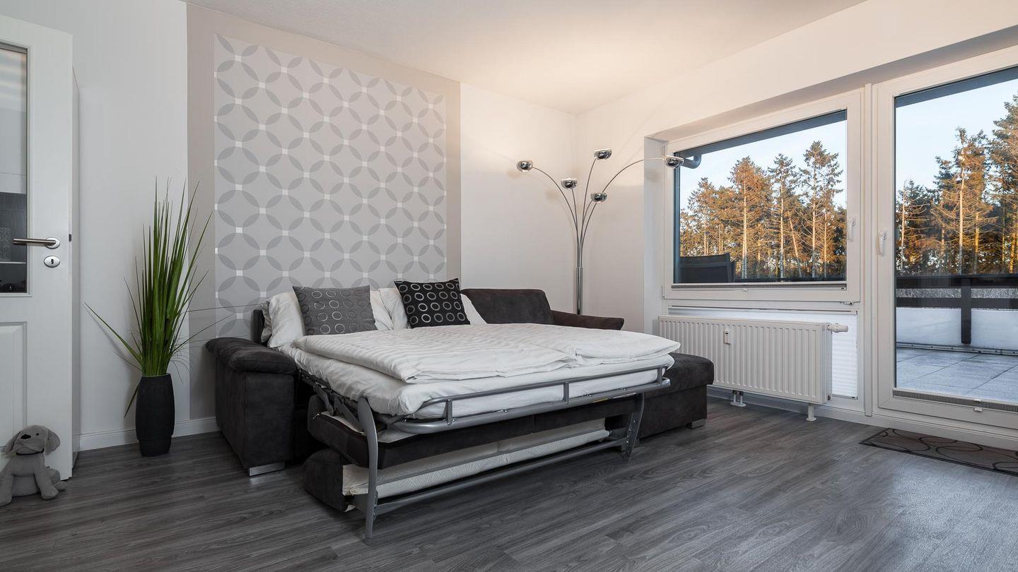 Das hell eingerichtete Wohnzimmer bietet ausreichend Platz für 4 Personen. Ein hochwertiges Schlafsofa lässt Sie wie im eigenem Bett schlafen.