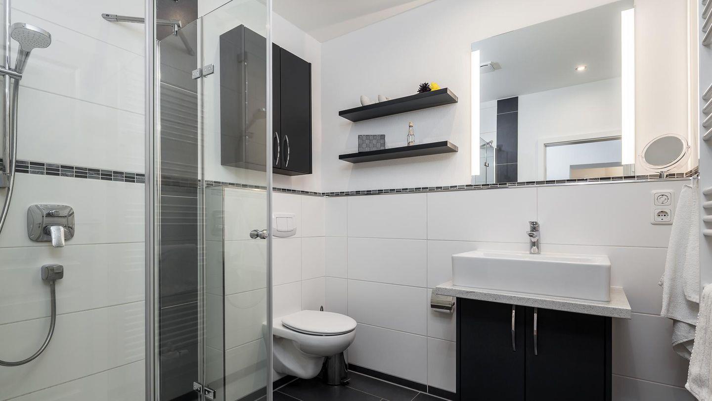 Das Duschbad mit seiner bodentiefen Dusche ist hell gefliest und bietet genug Platz für die persönlichen Dinge.