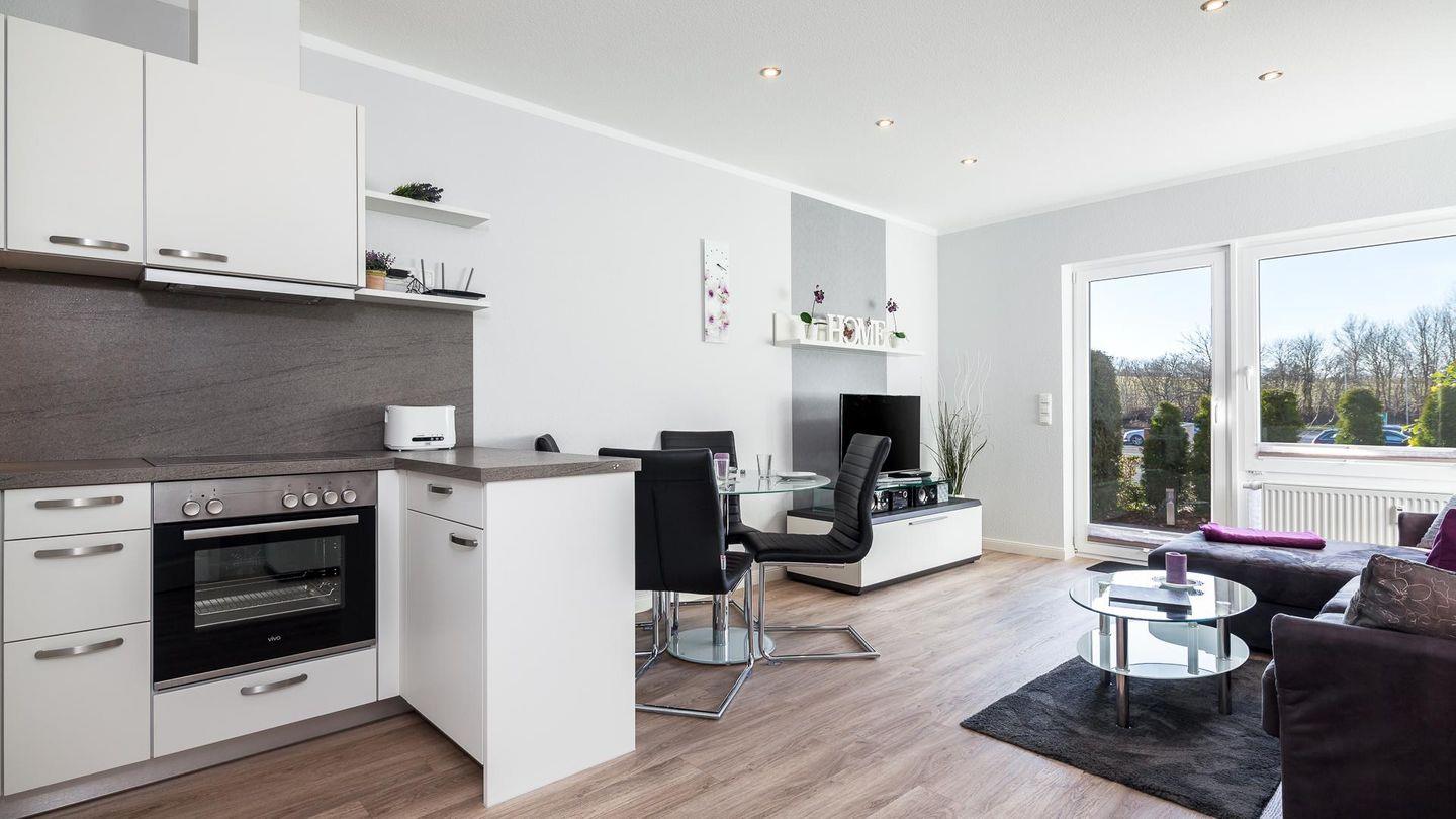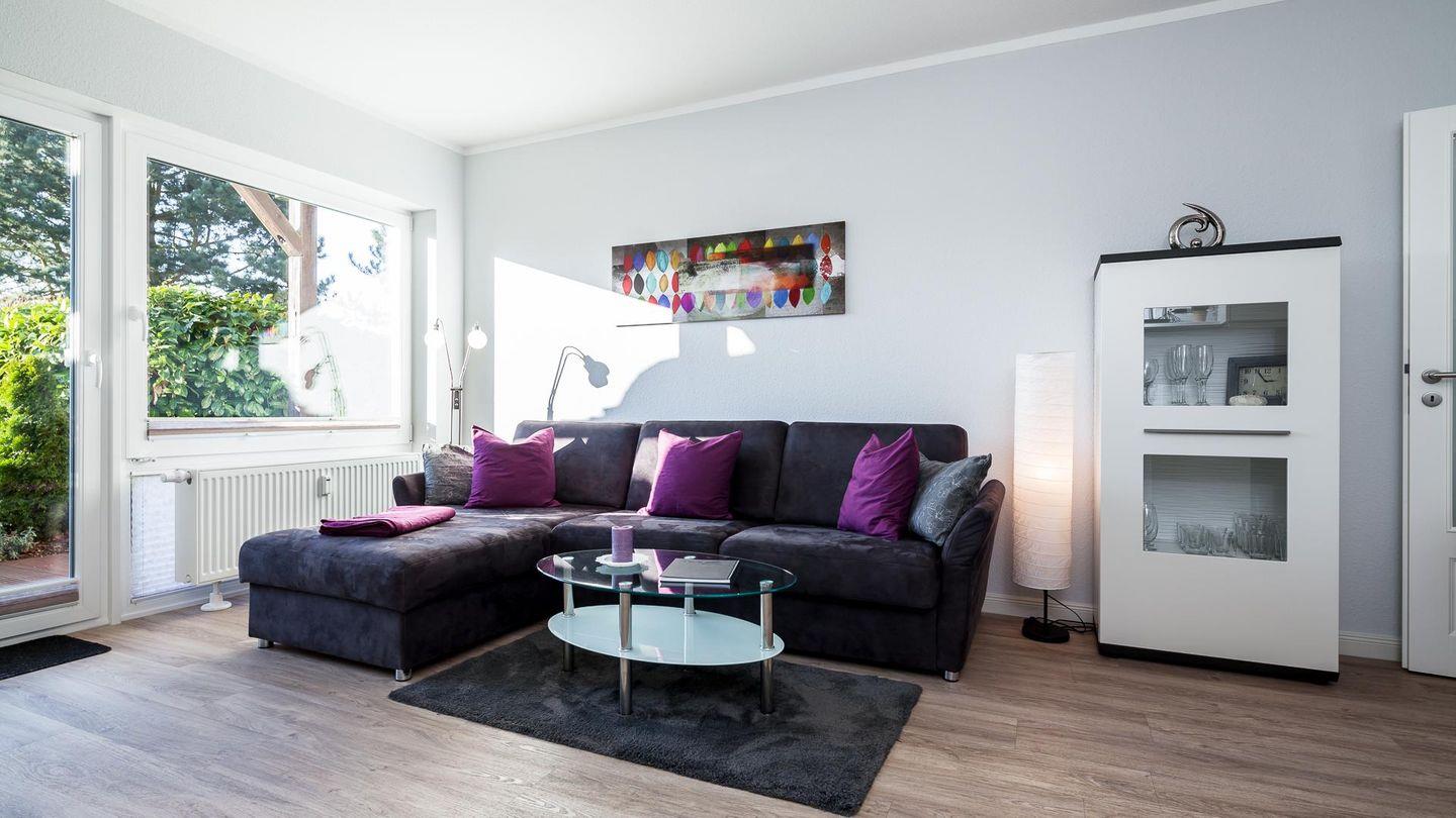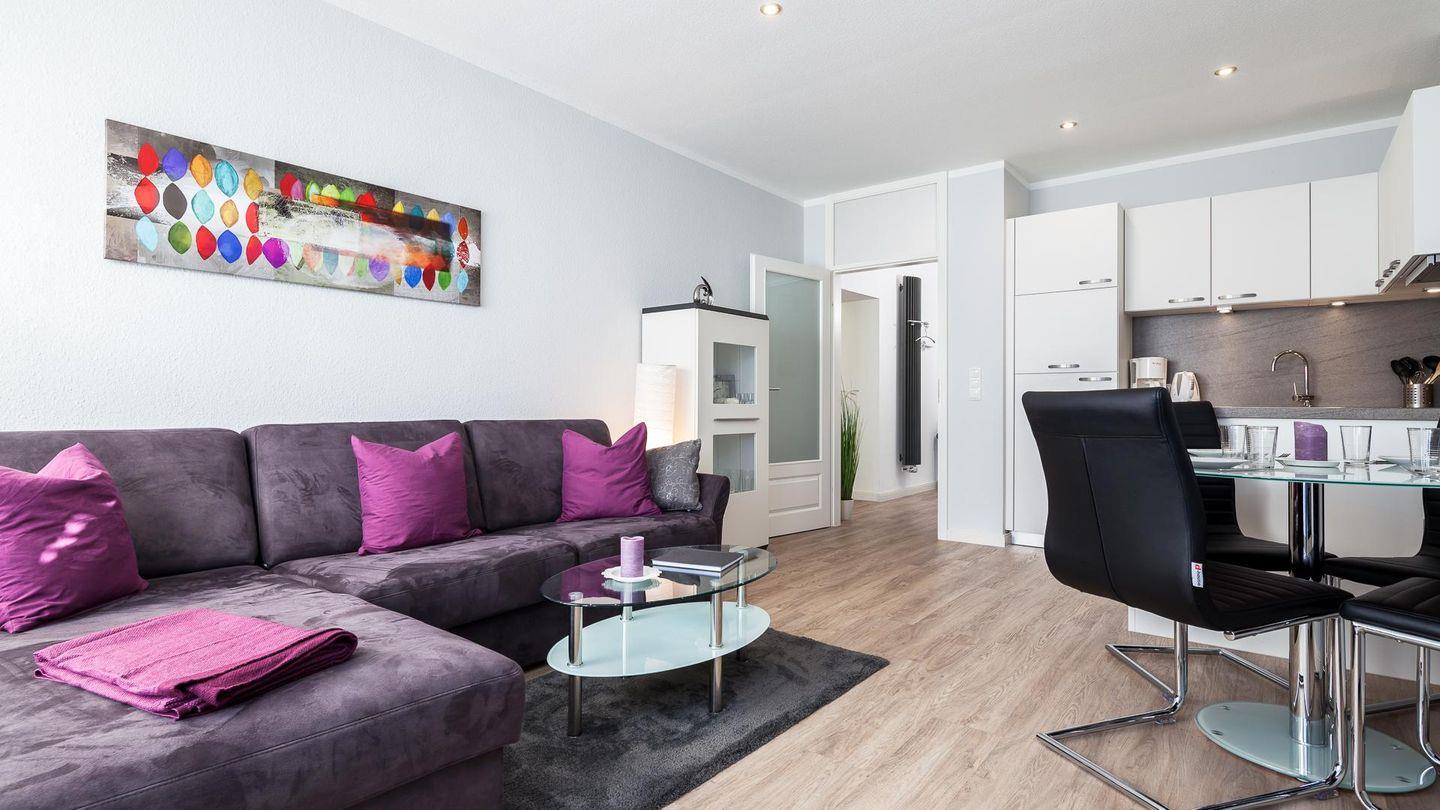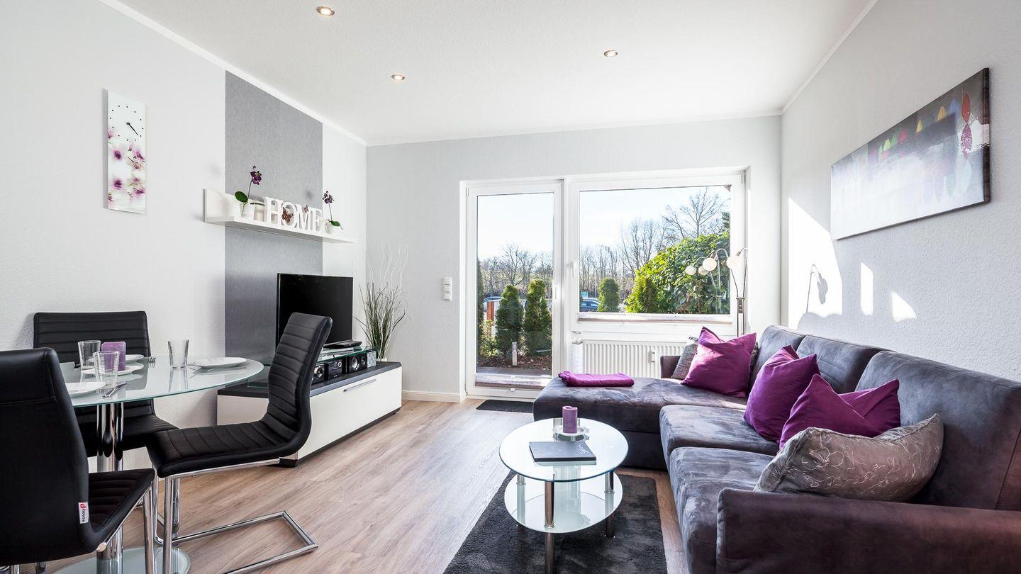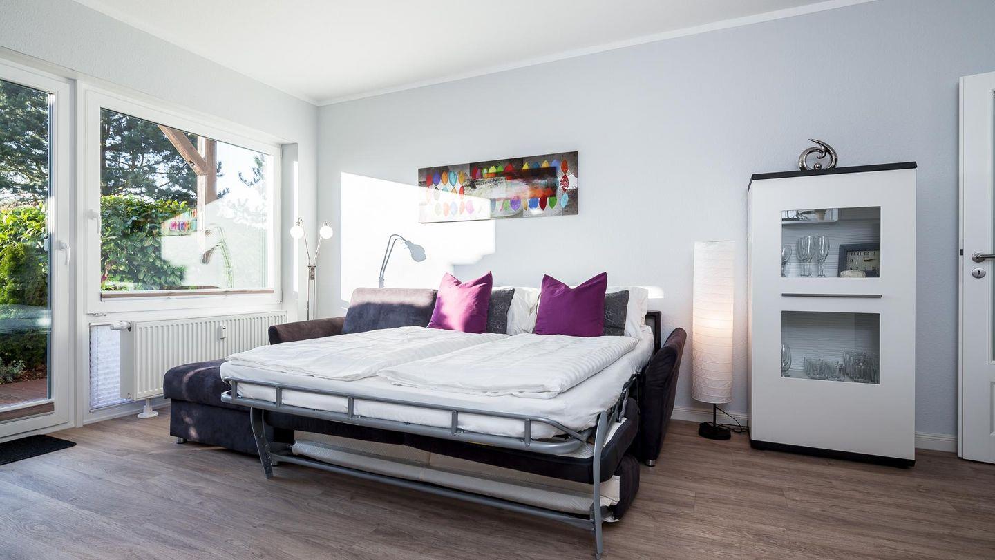 Das hell eingerichtete Wohnzimmer bietet ausreichend Platz für 4 Personen. Ein hochwertiges Schlafsofa lässt Sie wie im eigenem Bett schlafen.