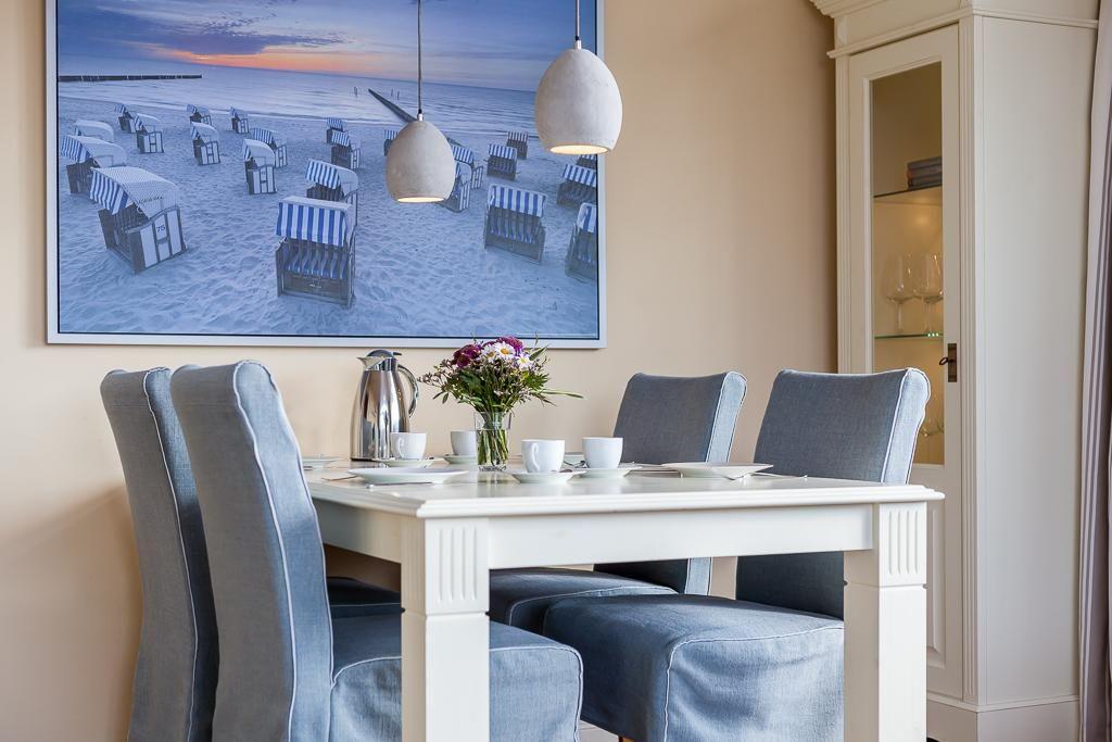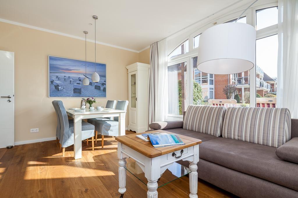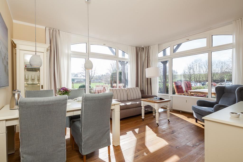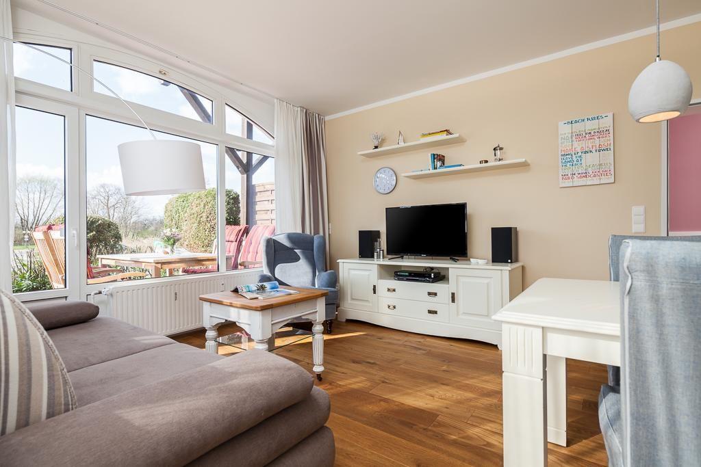 Im lichtdurchfluteten Wohnzimmer mit ausziehbarem Tisch für bis zu 6 Personen stehen zur Unterhaltung ein zweiter Flachbildfernseher und ein Blu-Ray-DVD/CD-Player bereit.